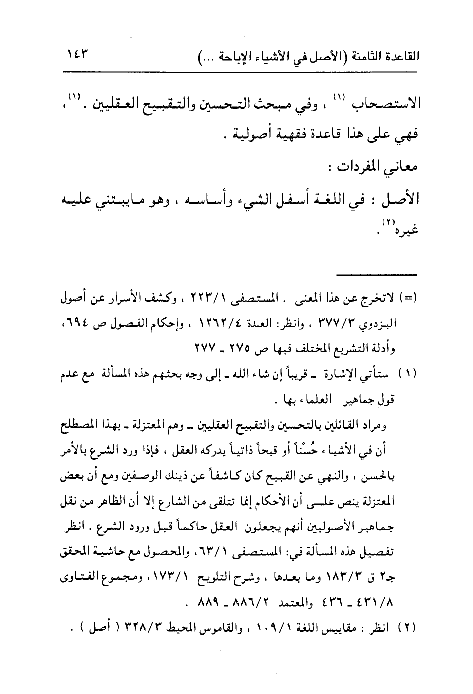 الاستصحاب١، وفي مبحث التحسين والتقبيح العقليين٢. فهي على هذا قاعدة فقهية أصولية.