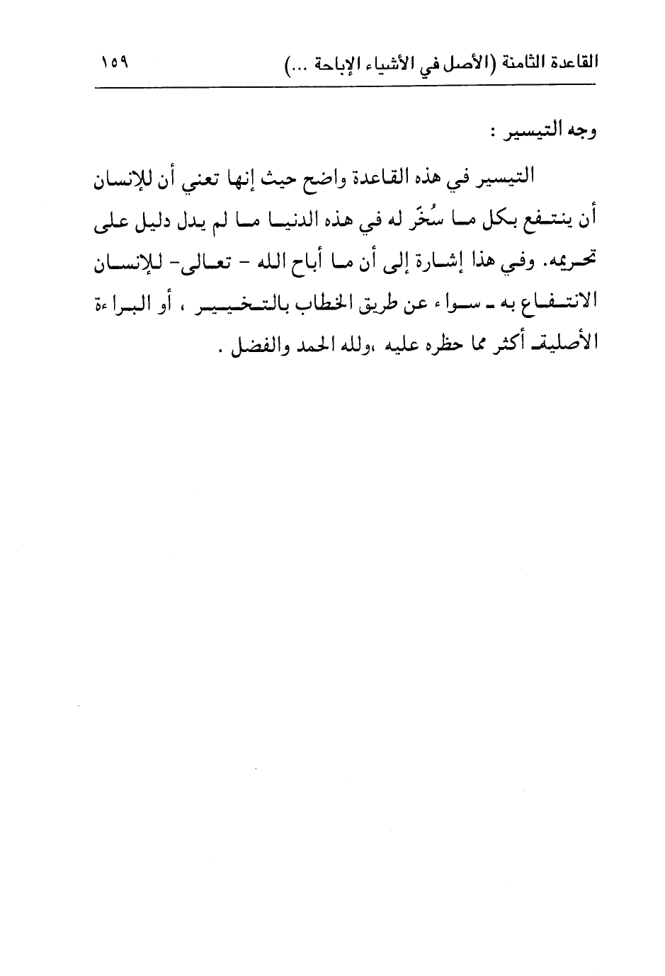 التيسير في هذه القاعدة واضح حيث إنها تعني أن للإنسان أن ينتفع بكل ما سُخّر له في هذه الدنيا ما لم يدل دليل على تحريمه. وفي هذا إشارة إلى أن ما أباح الله تعالى للإنسان الانتفاع به سواء عن طريق الخطاب بالتخيير، أو البراءة الأصلية أكثر مما حظره عليه، ولله الحمد والفضل.