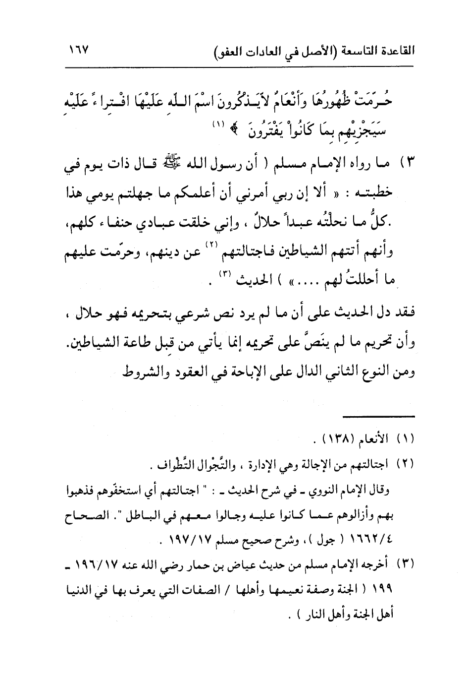 ٣) ما رواه الإمام مسلم أن رسول الله صلى الله عليه وسلم قال ذات يوم في خطبته: "ألا إن ربي أمرني أن أعلمكم ما جهلتم يومي هذه كل ما نحلْتُه عبدا حلال، وإني خلقت عبادي حنفاء كلهم، وأنهم أتتهم الشياطين فاجتالتهم٢ عن دينهم، وحرّمت عليهم ما أحللت لهم ... " ٣الحديث.