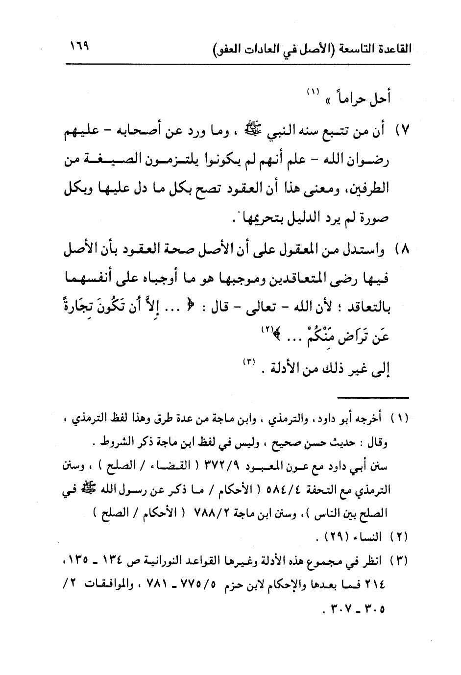 ١ أخرجه: أبو داود والترمذي وابن ماجه من عدة طرق وهذا لفظ الترمذي، وقال: حديث حسن صحيح، وليس في لفظ ابن ماجه ذكر الشروط. سنن أبي داود مع عون المعبود ٩/٣٧٢ (القضاء / الصلح) ، وسنن الترمذي مع التحفة ٤/٥٨٤ (الأحكام / ما ذكر عن رسول الله صلى الله عليه وسلم في الصلح بين الناس) ، وسنن ابن ماجه ٢/٧٨٨ (الأحكام / الصلح) .