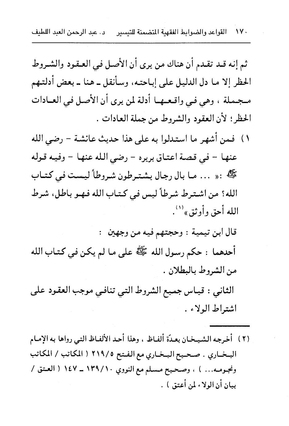 ١) فمن أشهر ما استدلوا به على هذا حديث عائشة رضي الله عنها في قصة اعتاق بريرة رضي الله عنها وفيه قوله صلى الله عليه وسلم: " ... ما بال رجال يشترطون شروطا ليست في كتاب الله؟ من اشترط شرطا ليس في كتاب الله فهو باطل، وشرط الله أحق وأوثق "١.