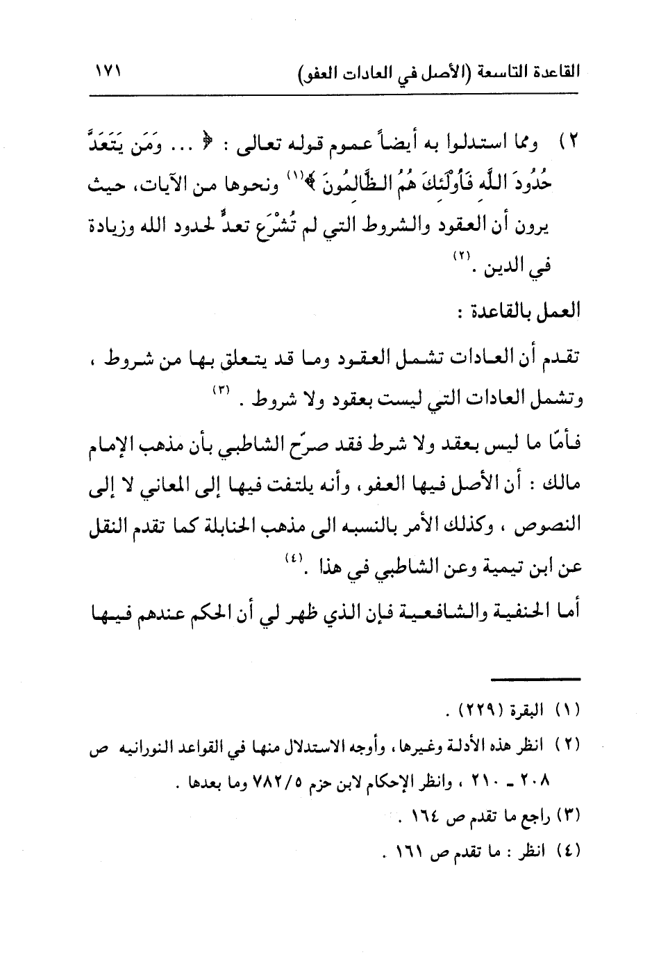 فأما ما ليس بعقد ولا شرط فقد صرح الشاطبي بأن مذهب الإمام مالك: أن الأصل فيها العفو، وأنه يلتفت فيها إلى المعاني لا إلى النصوص، وكذلك الأمر بالنسبة إلى مذهب الحنابلة كما تقدم النقل عن ابن تيمية وعن الشاطبي في هذا٤.