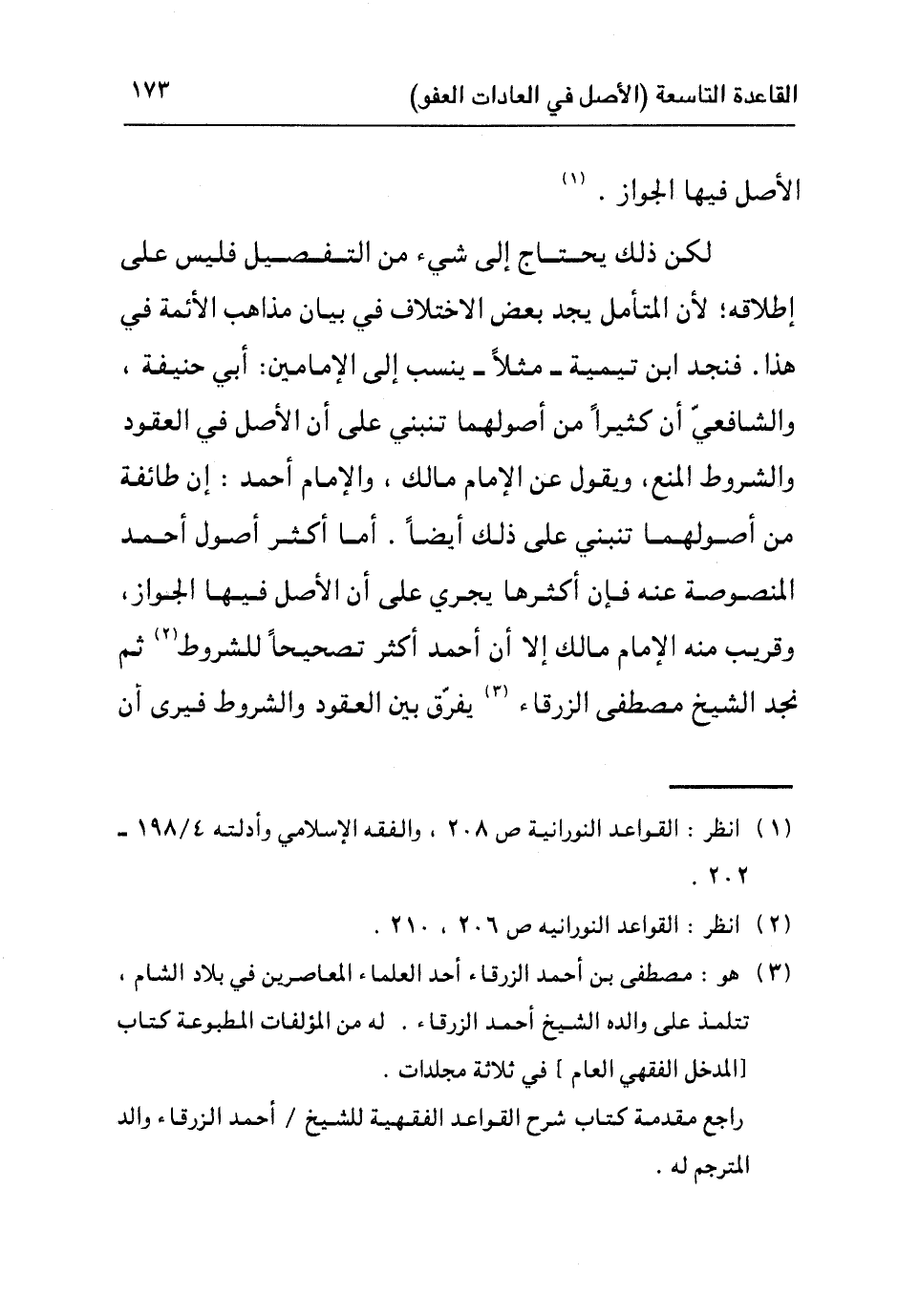 لكن ذلك يحتاج إلى شيء من التفصيل فليس على إطلاقه؛ لأن المتأمل يجد بعض الاختلاف في بيات مذاهب الأئمة في هذا. فنجد ابن تيمية مثلا ينسب إلى الإمامين: أبي حنيفة، والشافعيّ أن كثيرا من أصولهما تنبني على أن الأصل في العقود والشروط المنع، ويقول عن الإمام مالك، والإمام أحمد: إن طائفة من أصولهما تنبني على ذلك أيضا. أما أكثر أصول أحمد المنصوصة عنه فإن أكثرها يجري على أن الأصل فيها الجواز، وقريب منه الإمام مالك إلا أن أحمد أكثر تصحيحا للشروط٢ ثم نجد الشيخ مصطفى الزرقاء٣ يفرق بين العقود والشروط فيرى أن
