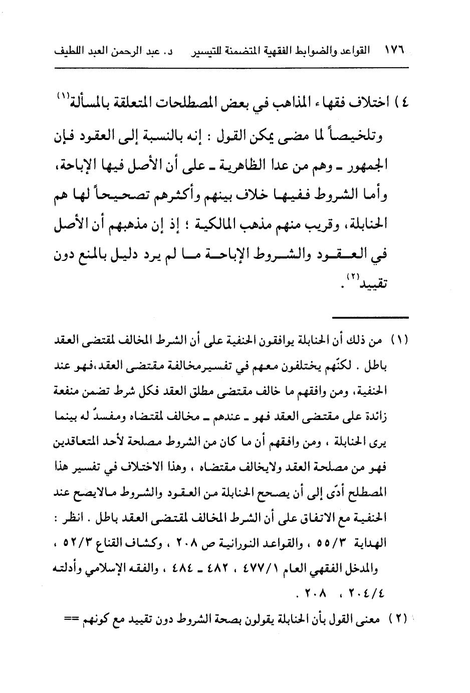 ٤) اختلاف فقهاء المذاهب في بغض المصطلحات المتعلقة بالمسألة١، وتلخيصها لما مضى يمكن القول: إنه بالنسبة إلى العقود فإن الجمهور - وهو من عدا الظاهرية - على أن الأصل فيها الإباحة، وأما الشروط ففيها خلاف بينهم وأكثرهم تصحيحا لها هم الحنابلة، وقريبا منهم المالكية؛ إذ إن مذهبهم أن الأصل في العقود والشروط الإباحة ما لم يرد دليل بالمنع دون تقييد٢.