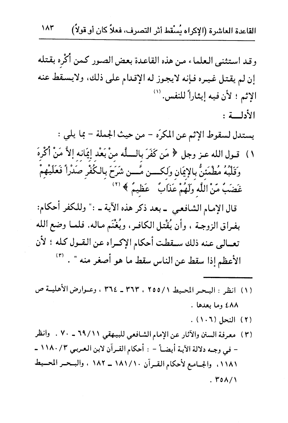١) قول الله عز وجل: {مَنْ كَفَرَ بِاللَّهِ مِنْ بَعْدِ إِيمَانِهِ إِلاّ مَنْ أُكْرِهَ وَقَلْبُهُ مُطْمَئِنٌّ بِالأِيمَانِ وَلَكِنْ مَنْ شَرَحَ بِالْكُفْرِ صَدْراً فَعَلَيْهِمْ غَضَبٌ مِنَ اللَّهِ وَلَهُمْ عَذَابٌ عَظِيمٌ} ٢.