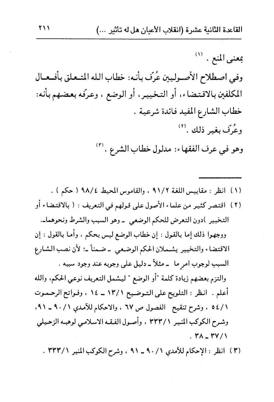 ٢ اقتصر كثير من علماء الأصول على قولهم في التعريف: "بالاقتضاء أو التخيير" دون التعرض للحكم الوضعي – وهو السبب والشرط ونحوهما – ووجهوا ذلك إما بالقول: إن خطاب الوضع ليس بحكم، وأما بالقول: إن الاقتضاء والتخيير يشملان الحكم الوضعي – ضمنا -؛ لأن نصب الشارع السبب لوجوب أمر ما – مثلا – دليل على وجوبه عند وجود سببه.