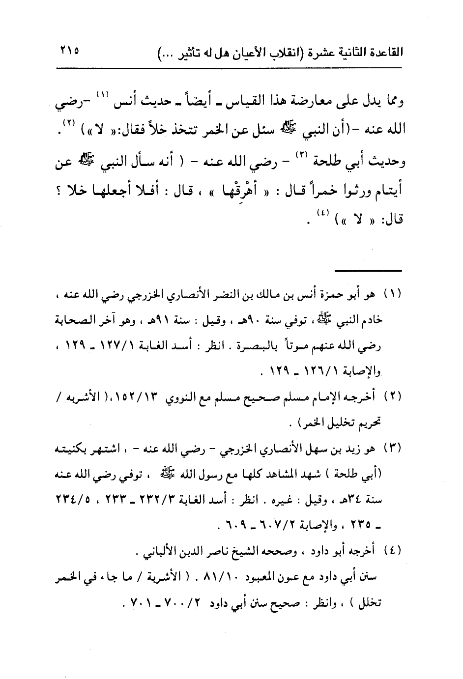 وحديث أبي طلحة٣ رضي الله عنه: "أنه سأل النبي صلى الله عليه وسلم عن أيتام ورثوا خمرا قال: "أهرقها"، قال: "أفلا أجعلها خلا؟ " قال: "لا" "٤.