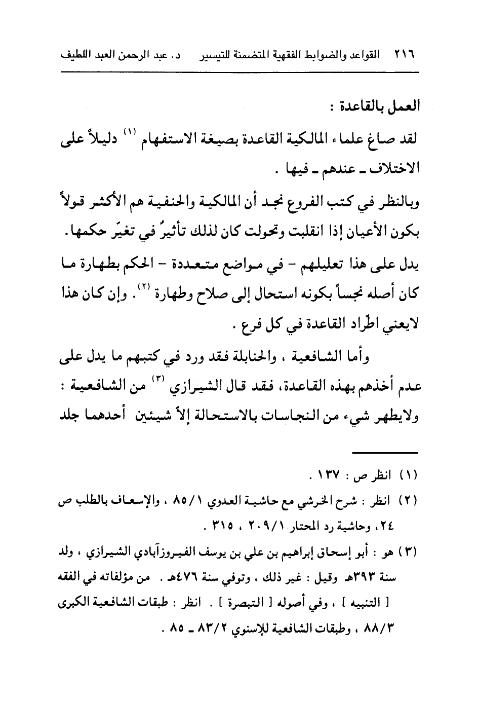 وبالنظر إلى كتب الفروع نجد أن المالكية والحنفية هم الأكثر قولا بكون الأعيان إذا انقلبت وتحولت كان لذلك تأثيرا في تغيّر حكمها. يدل على هذا تعليلهم - في مواضع متعددة - الحكم بطهارة ما كان أصله نجسا بكونه استحال إلى صلاح وطهارة٢. وإن كان هذا لا يعني اطّراد القاعدة في كل فرع.