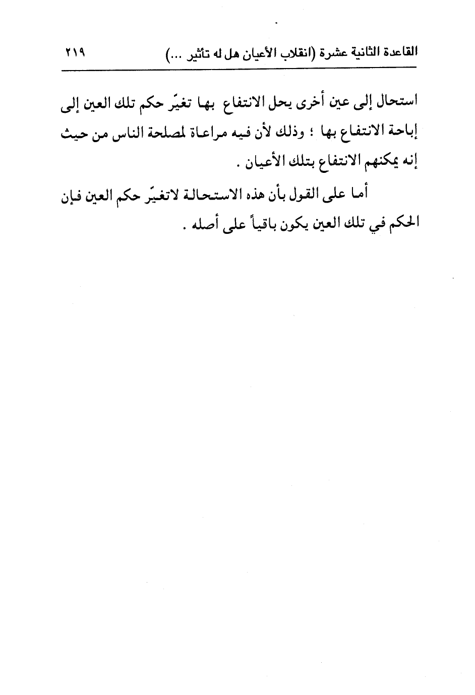 استحال إلى عين أخرى يحل الانتفاع بها تغير حكم تلك العين إلى إباحة الانتفاع بها؛ وذلك لأن فيه مراعاة لمصلحة الناس من حيث إنه يمكنهم الانتفاع بتلك الأعيان.