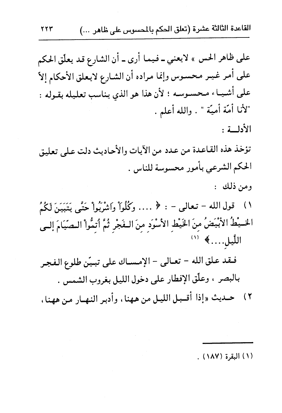 ١) قول الله تعالى: { ... وَكُلُوا وَاشْرَبُوا حَتَّى يَتَبَيَّنَ لَكُمُ الْخَيْطُ الأَبْيَضُ مِنَ الْخَيْطِ الأَسْوَدِ مِنَ الْفَجْرِ ثُمَّ أَتِمُّوا الصِّيَامَ إِلَى اللَّيْل ... } ١.