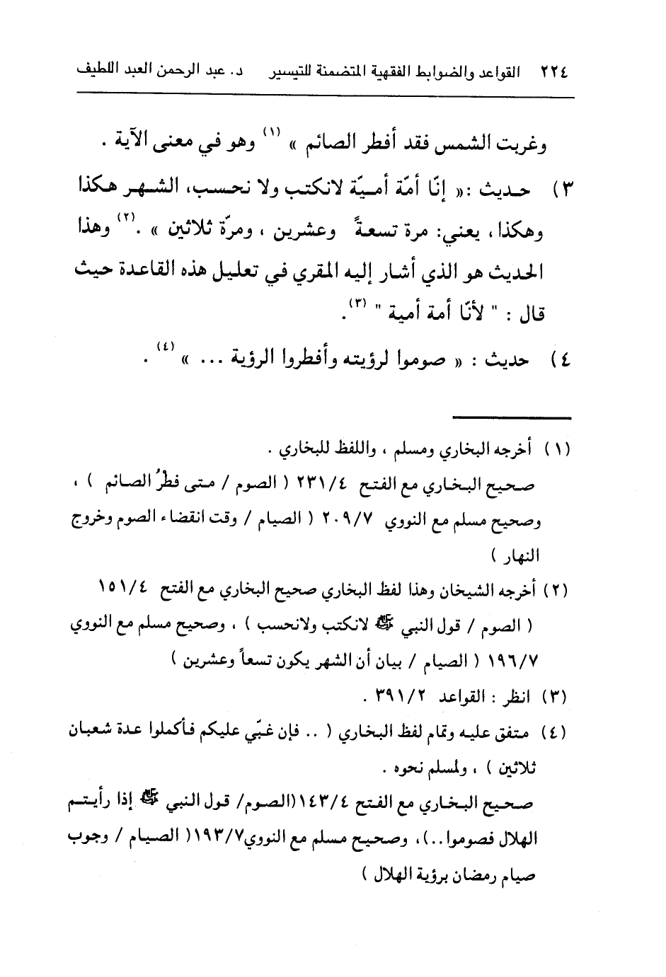 ٣) حديث: "إنا أمّة أميّة لا نكتب ولا نحسب، الشهر هكذا وهكذا، يعني مرة تسعة وعشرين، ومرّة ثلاثين" ٢.وهذا الحديث هو الذي أشار إليه المقري في تعليل هذه القاعدة حيث قال: "لأنّا أمّة أميّة"٣.