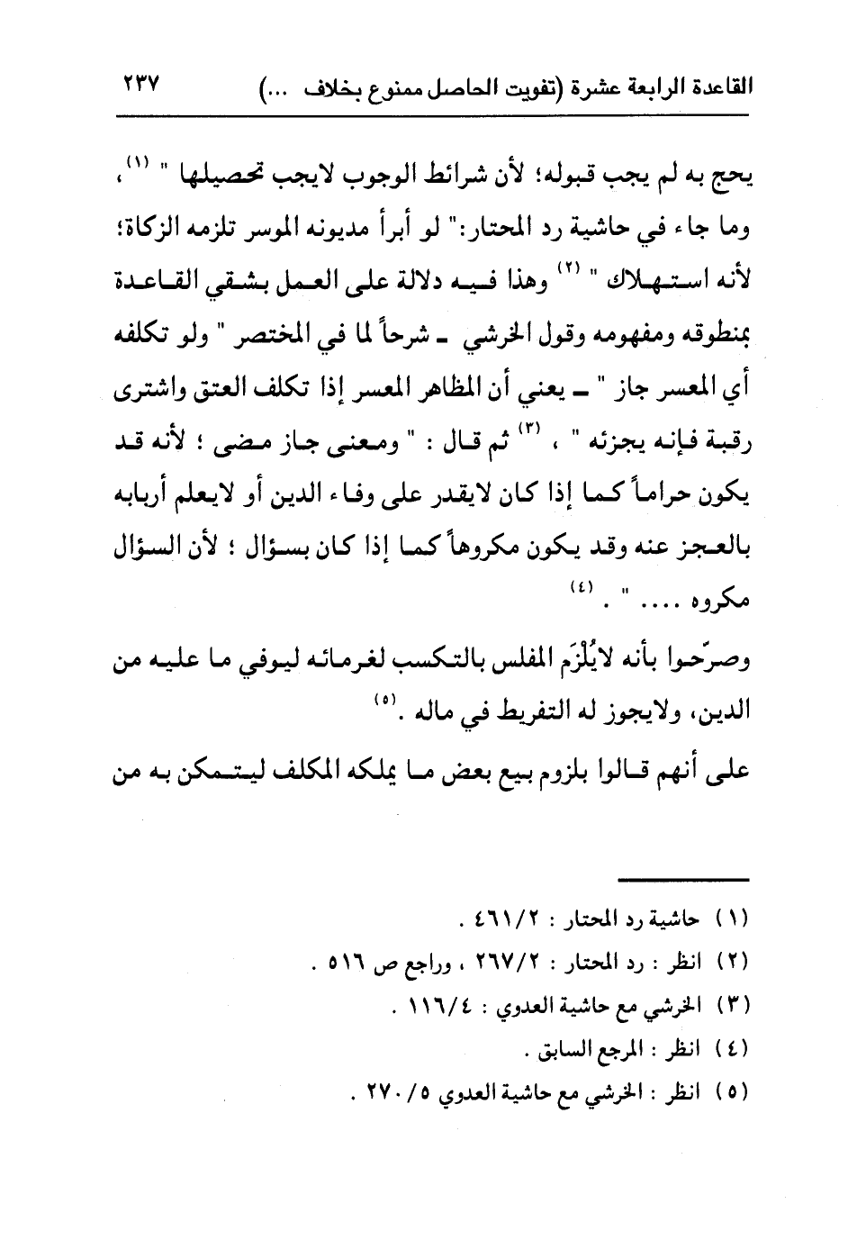 يحج به لم يجب قبوله؛ لأن شرائط الوجوب لا يجب تحصيلها"١، وما جاء في حاشية رد المحتار: "لو أبرأ مديونه الموسر تلزمه الزكاة؛ لأته استهلاك"٢ وهذا فيه دلالة على العمل بشقي القاعدة بمنطوقه ومفهومه وقول الخرشي - شرحا لما في المختصر -: "ولو تكلفه أي المعسر جاز" - يعني أن المظاهر المعسر إذا تكلف العتق واشترى رقبة فإنه يجزئه"٣، ثم قال: "ومعنى جاز مضى؛ لأته قد يكون حراما كما إذا كان لا يقدر على وفاء الدين أو لا يعلم أربابه بالعجز عنه وقد يكون مكروها كما إذا كان بسؤال؛ لأن السؤال مكروه ... "٤.