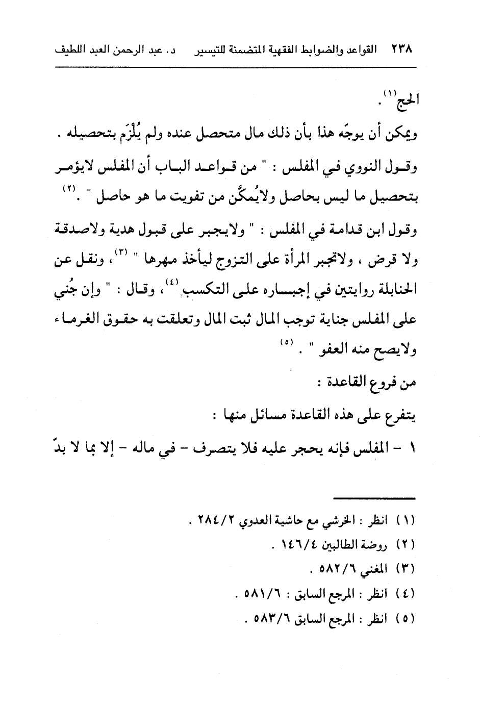 وقول ابن قدامة في المفلس: "ولا يجبر على قبول هدية ولا صدقة ولا قرض، ولا تجبر المرأة على التزوج ليأخذ مهرها"٣، وقال: "وإن جُني على المفاس جناية توجب المال ثبت المال وتعلقت به حقوق الغرماء ولا يصح منه العفو"٤.