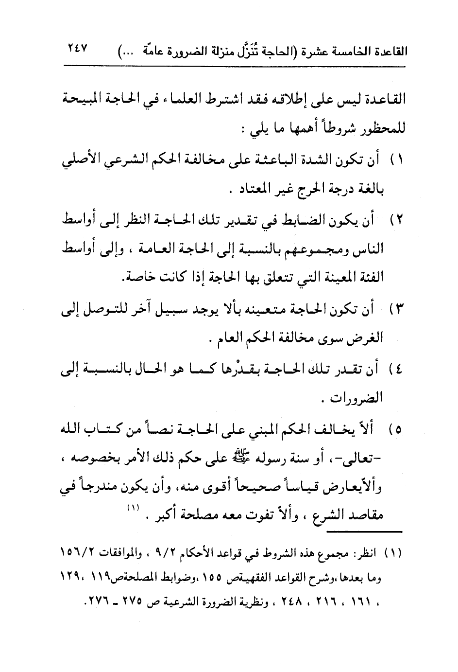 ٥) ألاّ يخالف الحكم المبني على الحاجة نصا من كتاب الله تعالى أو سنة رسوله صلى الله عليه وسلم على حكم ذلك الأمر بخصوصه، وألاّ يعارض قياسا صحيحا أقوى منه، وأن يكون مندرجا في مقاصد الشرع، وألاّ تفوت معه مصلحة أكبر١.