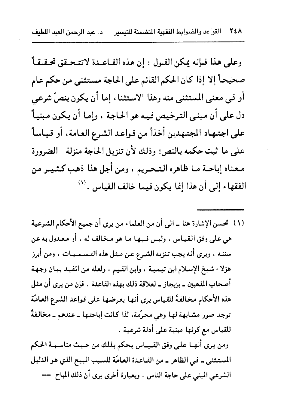 ١ تحسن الإشارة هنا إلى أن من العلماء من يرى أن جميع الأحكام الشرعية هي على وفق القياس، وليس فيها ما هون مخالف له، أو معدول به عن سننه، ويرى أنه يجب تنزيه الشرع من مثل هذه التسميات، ومن أبرز هؤلاء شيخ الإسلام ابن تيمية، وابن القيم، ولعله من المفيد بيان وجهة أصحاب المذهبين – بإيجاز – لعلاقة ذلك بهذه القاعدة. فإن من يرى أن مثل هذه الأحكام مخالفة للقياس يرى أنها بعرضها على قواعد الشرع العامة توجد صورة مشابهة لها وهي محرّمة، ولذا كانت إباحتها – عندهم – مخالفة للقياس مع كونها مبنية على أدلة شرعية.