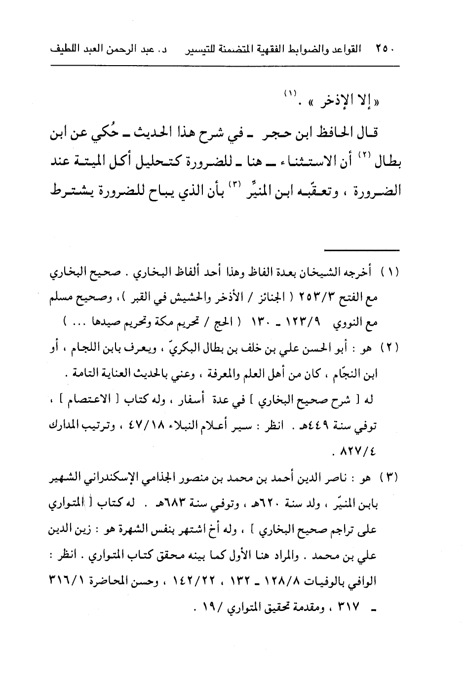قال الحافظ ابن حجر في شرح هذا الحديث: "حكي عن ابن بطال٢ ان الاستثناء – هنا – للضرورة كتحليل أكل الميتة عند الضرورة، وتعقبه ابن المنيِّر٣ بأن الذي يباح للضرورة يشترط