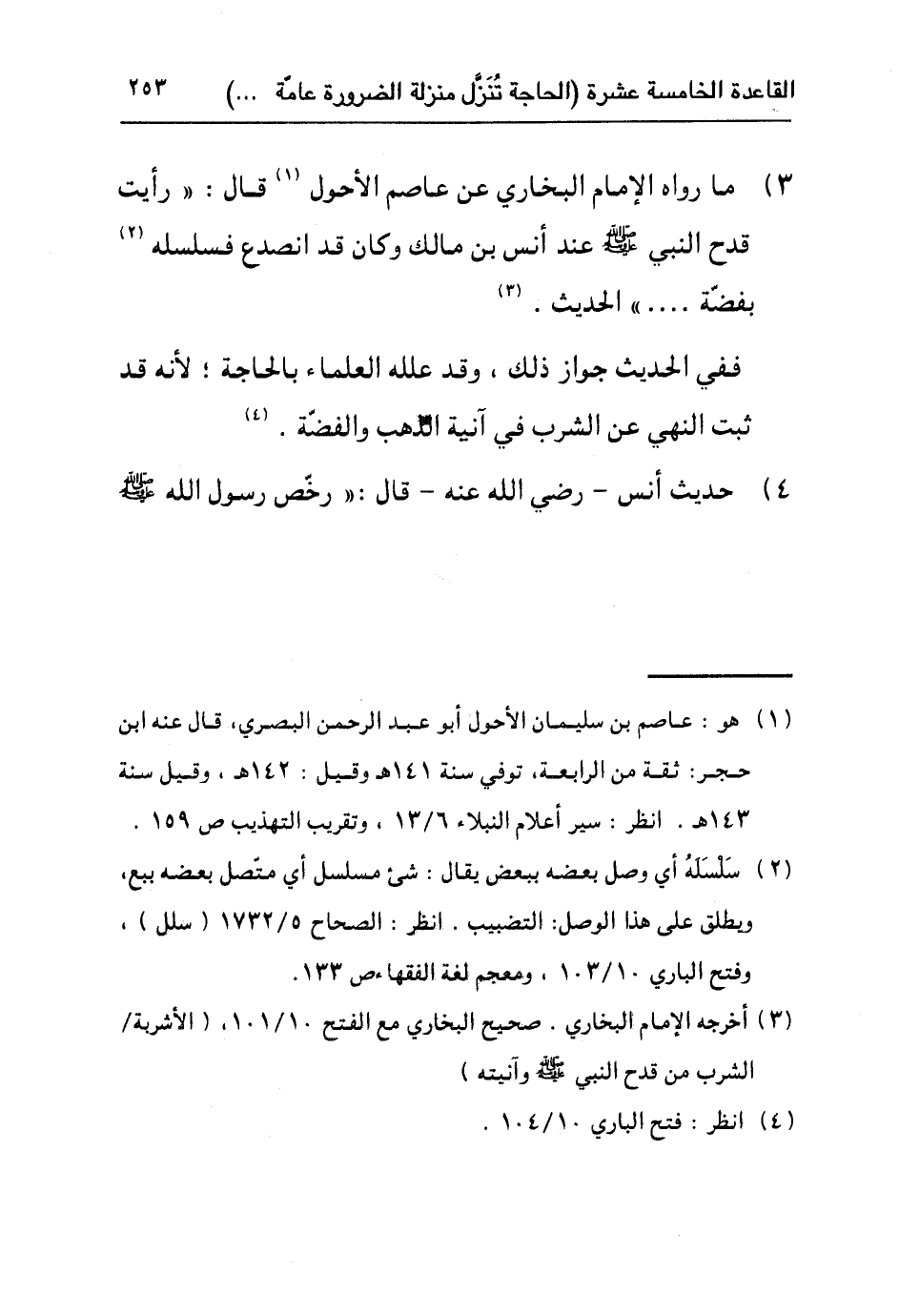 ٣) ما رواه الإمام البخاري عن عاصم الأحول١ قال: "رأيت قدح النبي صلى الله عليه وسلم عند أنس بن مالك وكان انصدع فسلسله٢ بفضة ... " الحديث٣.