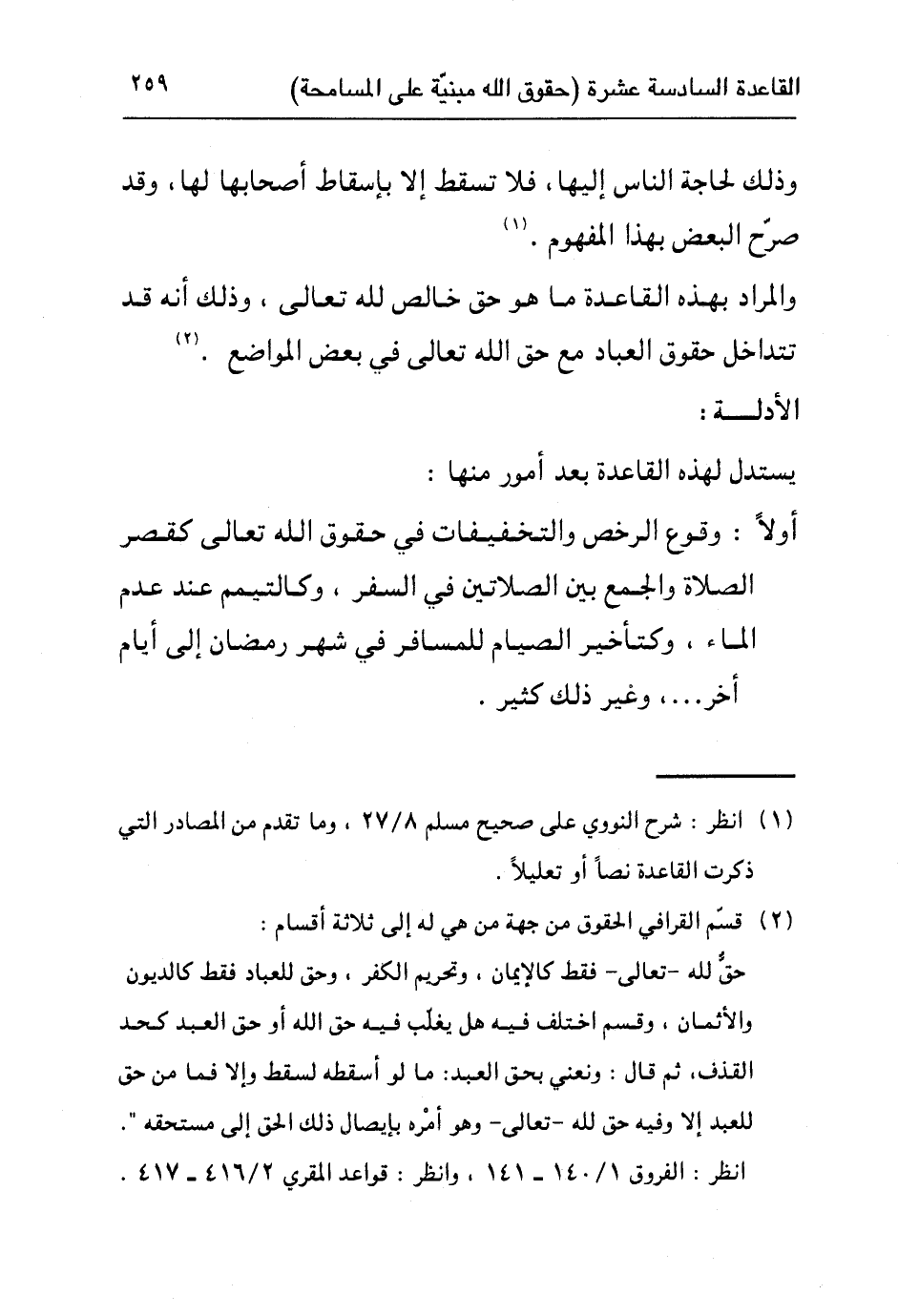 ٢ قسّم القرافي الحقوق من جهة من هي له إلى ثلاثة أقسام: