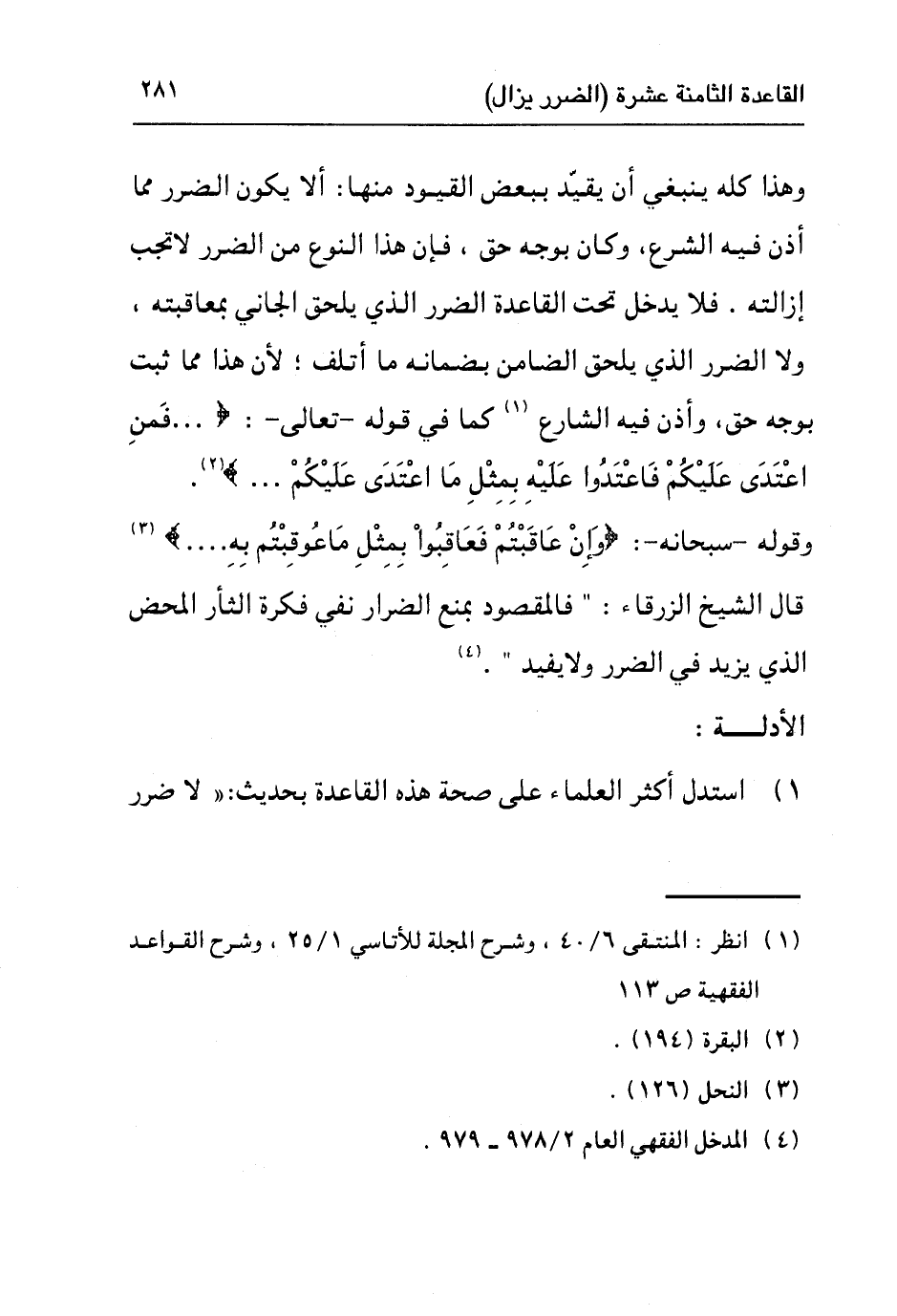 قال الشيخ الزرقاء: "فالمقصود بمنع الضرار نفي فكرة الثأر المحض الذي يزيد في الضرر ولا يفيد"٤.