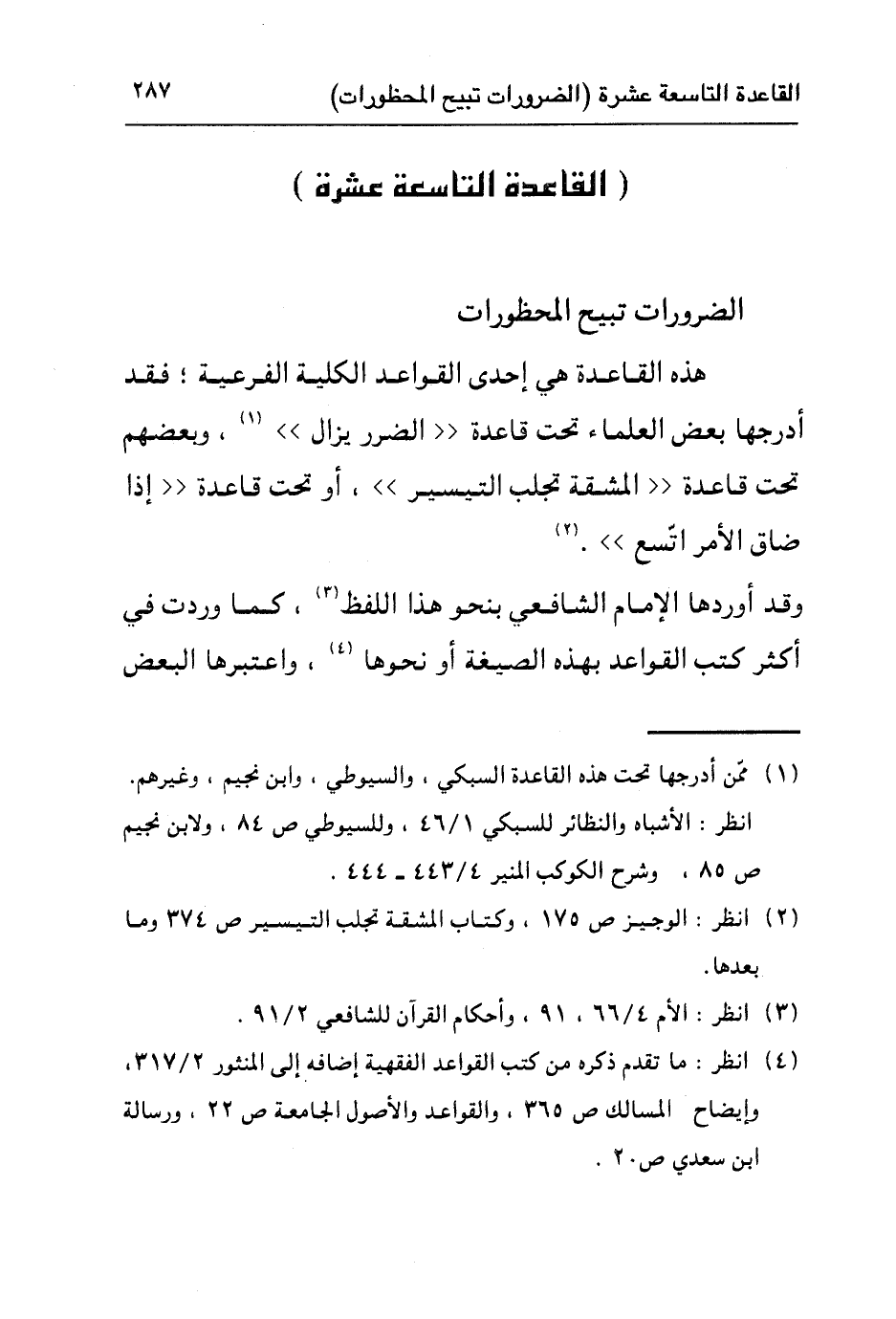 ٤ انظر: ما تقدم ذكره من كتب القواعد الفقهية إضافة إلى المنثور ٢/٣١٧، وإيضاح المسالك ص٣٦٥، والقواعد والأصول الجامعة ص٢٢، ورسالة ابن سعدي ص٢٠.