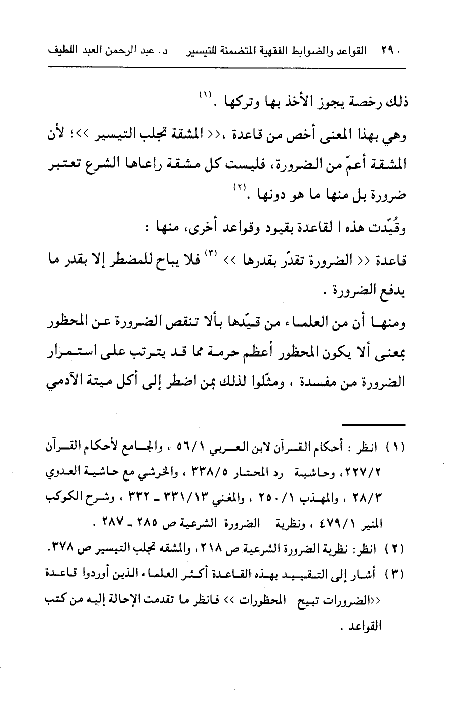 ٣ أشار إلى التقييد بهذه القاعدة أكثر العلماء الذين أوردوا قاعدة ((الضرورات تبيح المحظورات)) فانظر ما تقدمت الإحالة إليه من كتب القواعد.