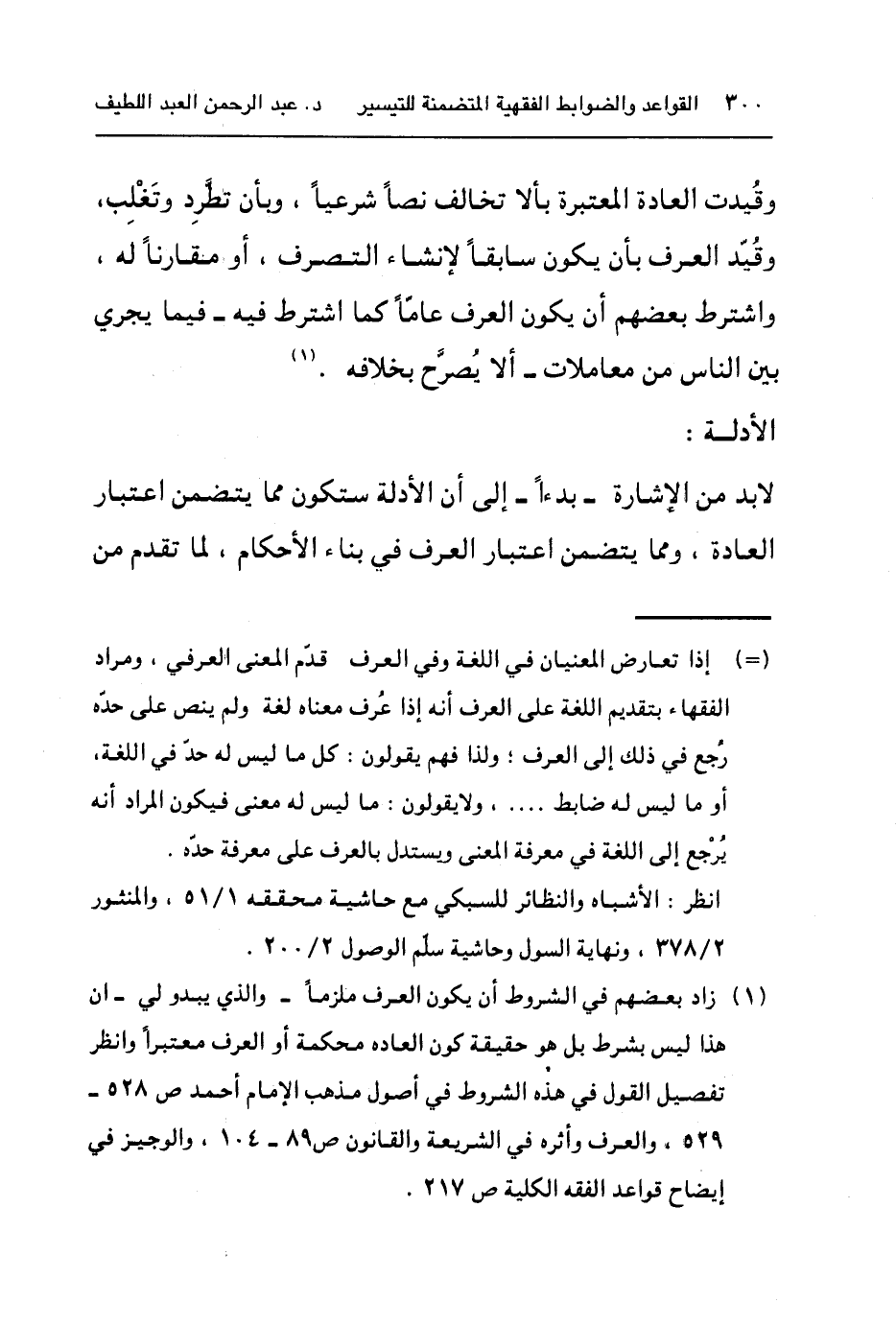 ١ زاد بعضهم في الشروط أن يكون العرف ملزما – والذي يبدو لي – أن هذا ليس بشرط بل هو حقيقة كون العادة محكمة أو العرف معتبرا وانظر تفصيل القول في هذه الشروط في أصول مذهب الإمام أحمد ص٥٢٨-٥٢٩، والعرف وأثره في الشريعة والقانون ص٨٩-١٠٤، والوجيز في إيضاح قواعد الفقه الكلية ص٢١٧.
