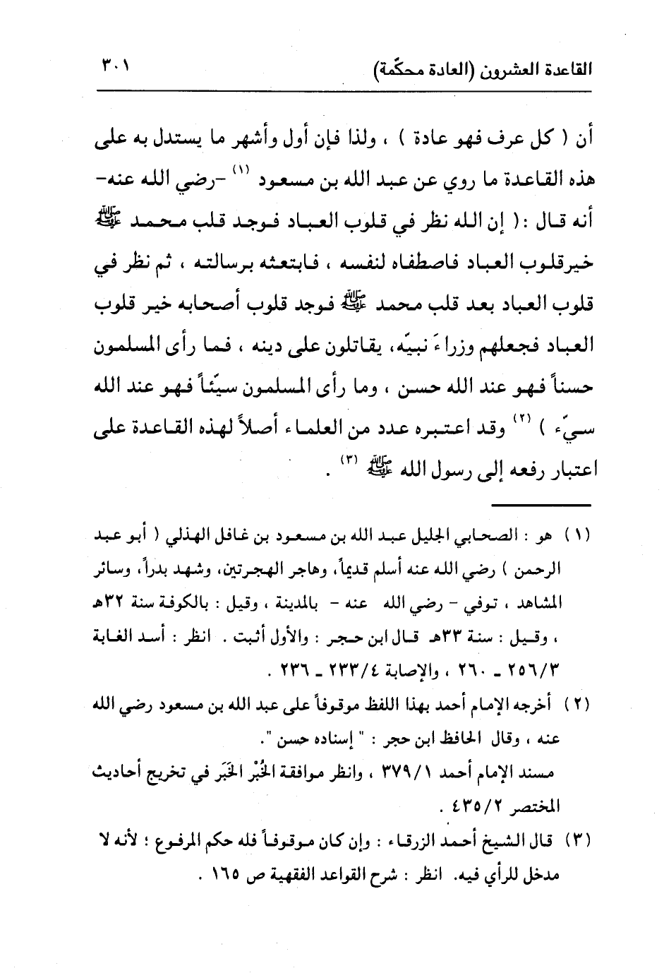 أن (كل عرف فهو عادة) ، ولذا فإن أول وأشهر ما يستدل به على هذه القاعدة ما روي عن عبد الله بن مسعود١ رضي الله عنه أنه قال: "إن الله نظر في قلوب العباد فوجد قلب محمد صلى الله عليه وسلم خير قلوب العباد فاصطفاه لنفسه، فابتعثه برسالته، ثم نظر في قلوب العباد بعد قلب محمد صلى الله عليه وسلم فوجد قلوب أصحابه خير قلوب العباد فجعلهم وزراء نبيه، يقاتلون على دينه، فما رأى المسلمون حسنا فهو عند الله حسن، وما رأى المسلمون سيئا فهو عند الله سيء"٢ وقد اعتبره عدد من العلماء أصلا لهذه القاعدة على اعتبار رفعه إلى رسول الله صلى الله عليه وسلم٣.