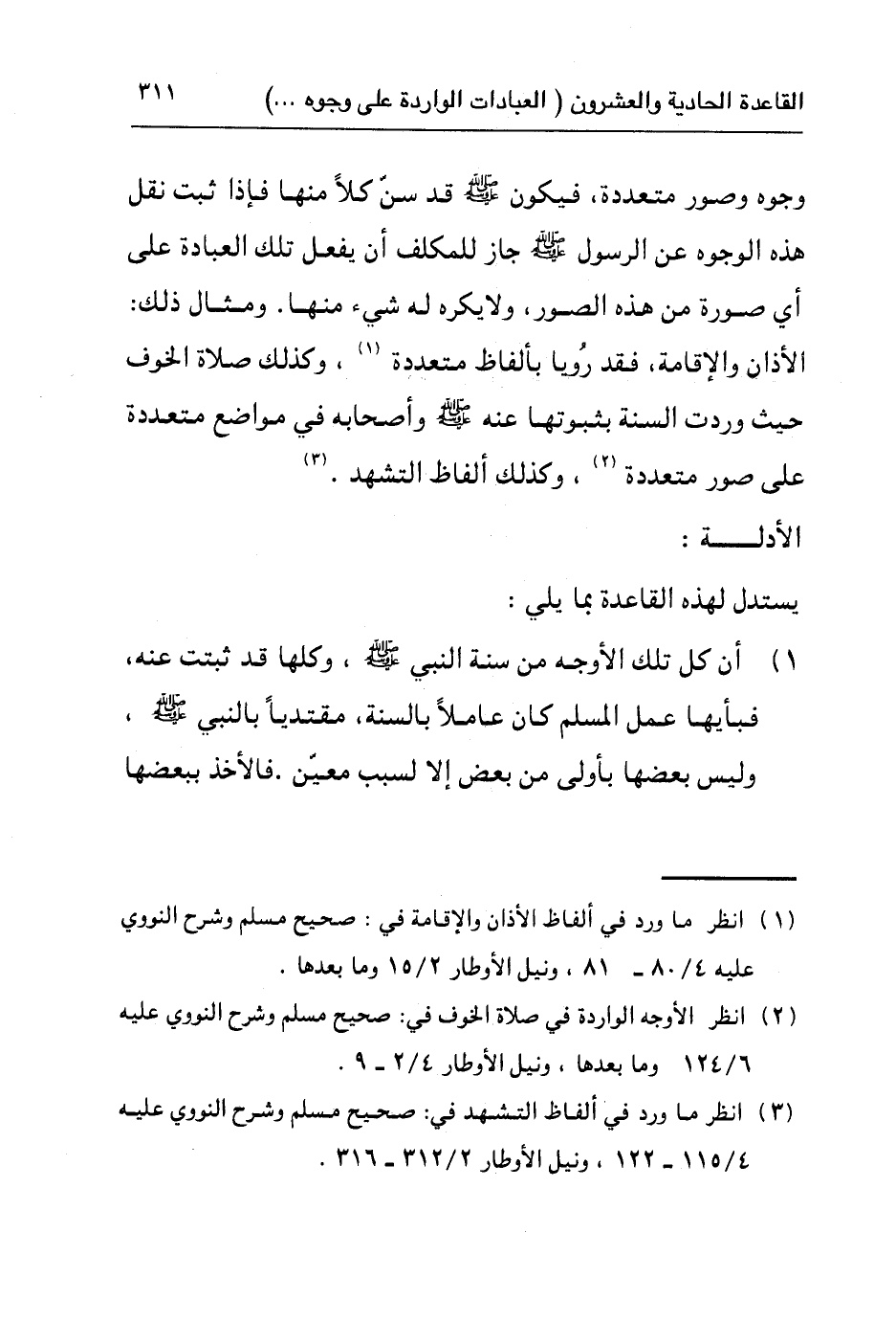 وجوه وصور متعددة، فيكون صلى الله عليه وسلم قد سنّ كلا منها فإذا ثبت نقل هذه الوجوه عن الرسول صلى الله عليه وسلم جاز للمكلف أن يفعل تلك العبادة على أي صورة من هذه الصور، ولا يكره له شيء منها. مثال ذلك: الأذان والإقامة، فقد روي بألفاظ متعددة١، وكذلك صلاة الخوف حيث وردت السنة بثبوتها عنه صلى الله عليه وسلم وأصحابه في مواضع متعددة على صور متعددة٢، وكذلك ألفاظ التشهد٣.