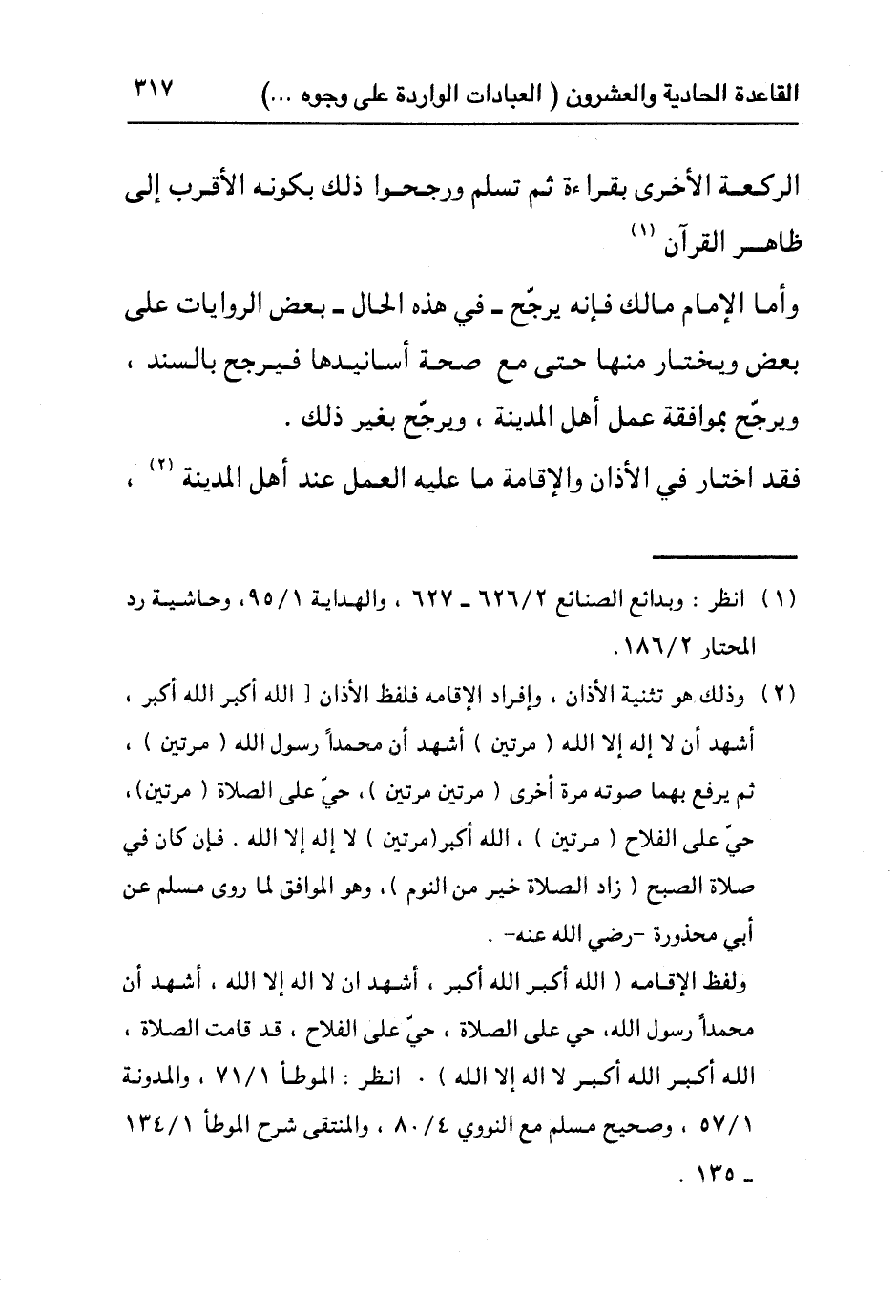 ولفظ الإقامة (الله أكبر الله أكبر، أشهد أن لا إله إلا الله، أشهد أن محمدا رسول الله، حيّ على الصلاة، حيّ على الفلاح، قد قامت الصلاة، الله أكبر الله أكبر لا إله إلا الله) . انظر: الموطأ ١/٧١، والكمونة ١/٥٧، وصحيح مسلم مع النووي ٤/٨٠، والمنتقى شرح الموطأ ١/١٣٤-١٣٥.