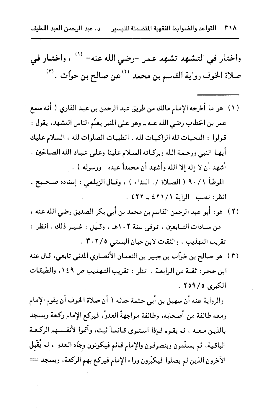واختار في التشهد تشهد عمر رضي الله عنه١، واختار في صلاة الخوف رواية القاسم بن محمد٢ عن صالح بن خوّات٣.