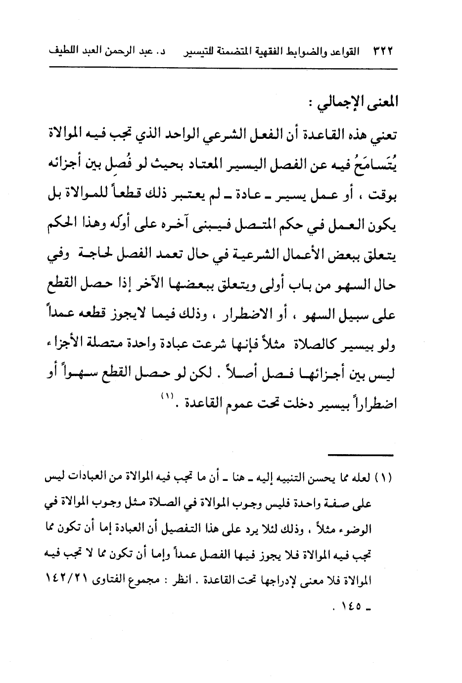 ١ لعله مما يحسن التنبيه إليه - هنا - أن ما تجب فيه الموالاة من العبادات ليس على صفة واحدة فليس وجوب الموالاة في الصلاة مثل وجوب الموالاة في الوضوء مثلا، وذلك لئلا يرد على هذا التفصيل أن العبادة إما أن تكون مما تجب فيه الموالاة فلا يجوز فيها الفصل عمدا وإما أن تكون مما لا تجب فيه الموالاة غلا معنى لإدراجها تحت القاعدة. انظر: مجموع الفتاوى ٢١/١٤٢-١٤٥.