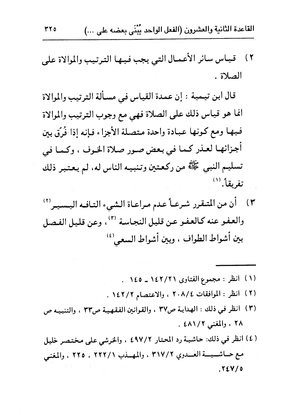قال ابن تيمية: "إن عمدة القياس في مسألة الترتيب والموالاة إنما هو قياس ذلك على الصلاة فهي مع وجوب الترتيب والموالاة فيها ومع كونها عبادة واحدة متصلة الأجزاء فإنه إذا فرق بين أجزائها لعذر كما في بعض صور صلاة الخوف، وكما في تسليم النبي صلى الله عليه وسلم من ركعتين وتنبيه الناس له، لم يعتبر ذلك تفريقا"١.