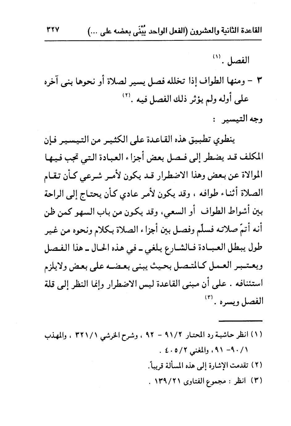 ٣- ومنها الطواف إذا تخلله يسير لصلاة أو نحوها بنى آخره على أوله ولم يؤثر ذلك الفصل فيه٢.