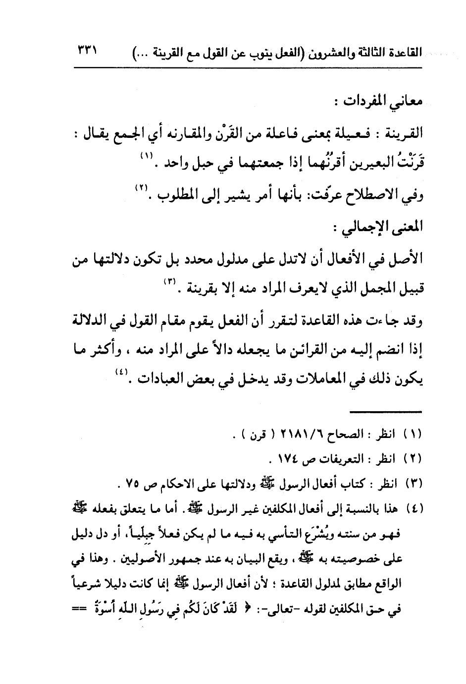 ٤ هذا بالنسبة إلى أفعال المكلفين غير الرسول صلى الله عليه وسلم. أما ما يتعلق بفعله صلى الله عليه وسلم فهو خصوصيته به صلى الله عليه وسلم، ويقع البيان به عند جمهور الأصوليين. وهذا في الواقع مطابق لمدلول القاعدة؛ لأن أفعال الرسول صلى الله عليه وسلم إنما كانت دليلا شرعيا في حق المكلفين لقوله تعالى: {لَقَدْ كَانَ لَكُمْ فِي رَسُولِ اللَّهِ أُسْوَةٌ حَسَنَةٌ} الأحزاب (٢١) ، ونحوها. انظر: توضيح الأفكار ١/٣، ومقدمة نزهة النظر ص٥، والمستصفى ١/٣٦٦، والإحكام للآمدي ٣/٢٤، وشرح الكوكب المنير ٢/١٦٠، وفواتح الرحموت ٢/٤٥.