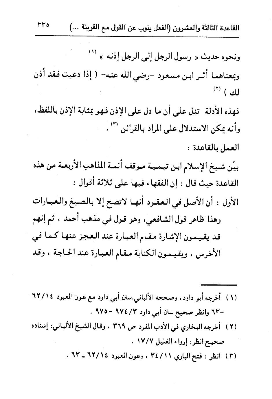 فهذه الأدلة تدل على أن ما دل على الإذن فهو بمثابة الإذن باللفظ، وأنه يمكن الاستدلال على المراد بالقرائن٣.