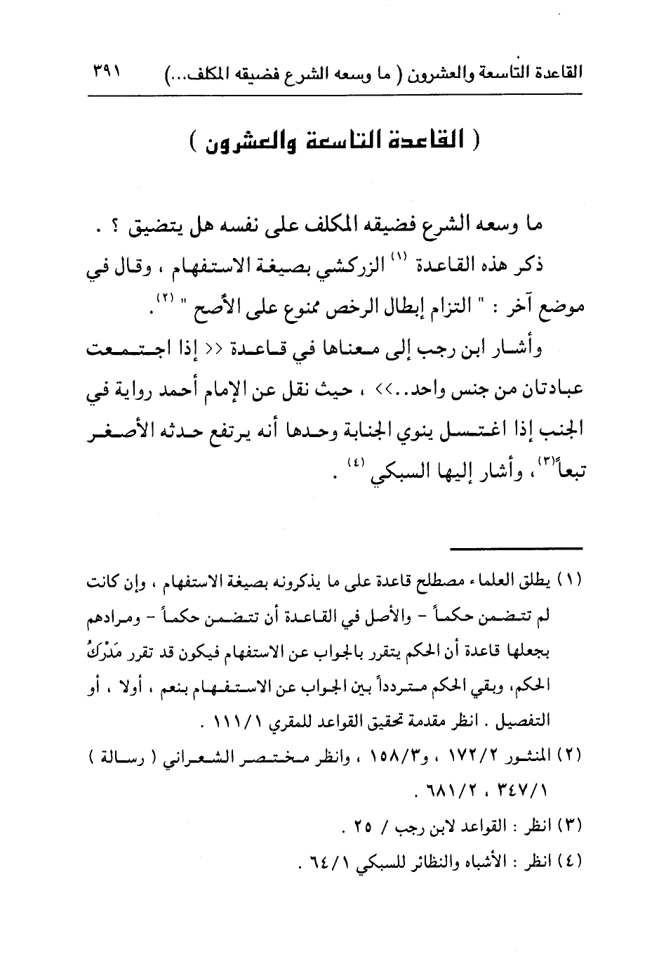 ١ يطلق العلماء مصطلح قاعدة على ما يذكرونه بصيغة الاستفهام، وإن كانت لم تتضمن حكما - والأصل في القاعدة أن تتضمن حكما - ومرادهم بجعلها قاعدة أن الحكم يتقرر بالجواب عن الاستفهام فيكون قد تقرر مدرك الحكم، وبقي الحكم مترددا بين الجواب عن الاستفهام بنعم، أو لا، أو التفصيل. انظر: مقدمة تحقيق القواعد للمقري ١/١١١.