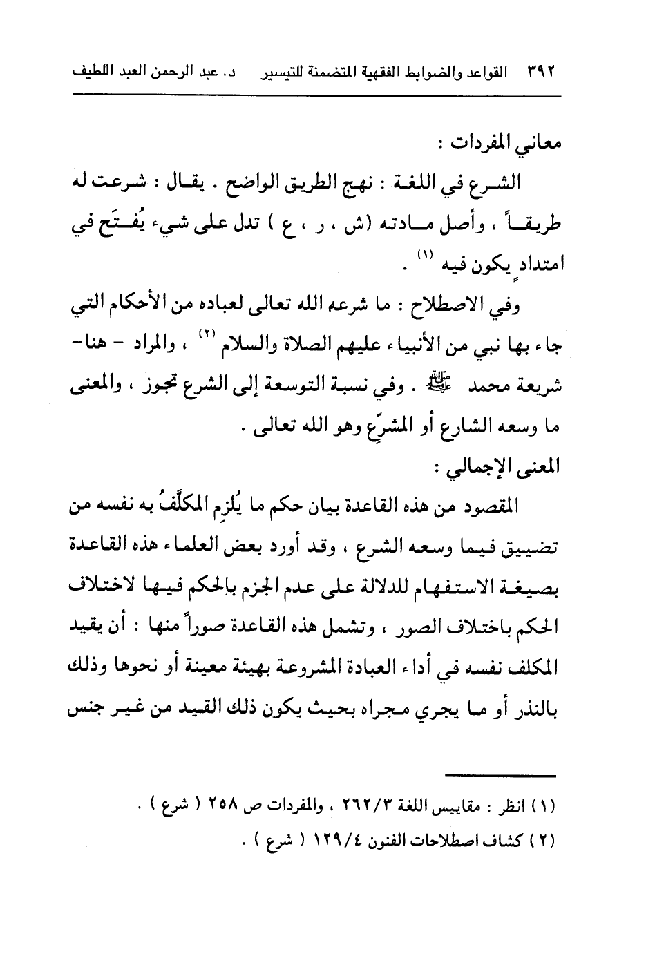 وفي الاصطلاح: ما شرعه الله تعالى لعباده من الأحكام التي جاء بها نبي من الأنبياء عليهم الصلاة والسلام٢، والمراد - هنا - شريعة محمد صلى الله عليه وسلم. وفي نسبة التوسعة إلى الشرع تجوز، والمعنى ما وسعه الشارع أو المشرع وهو الله تعالى.