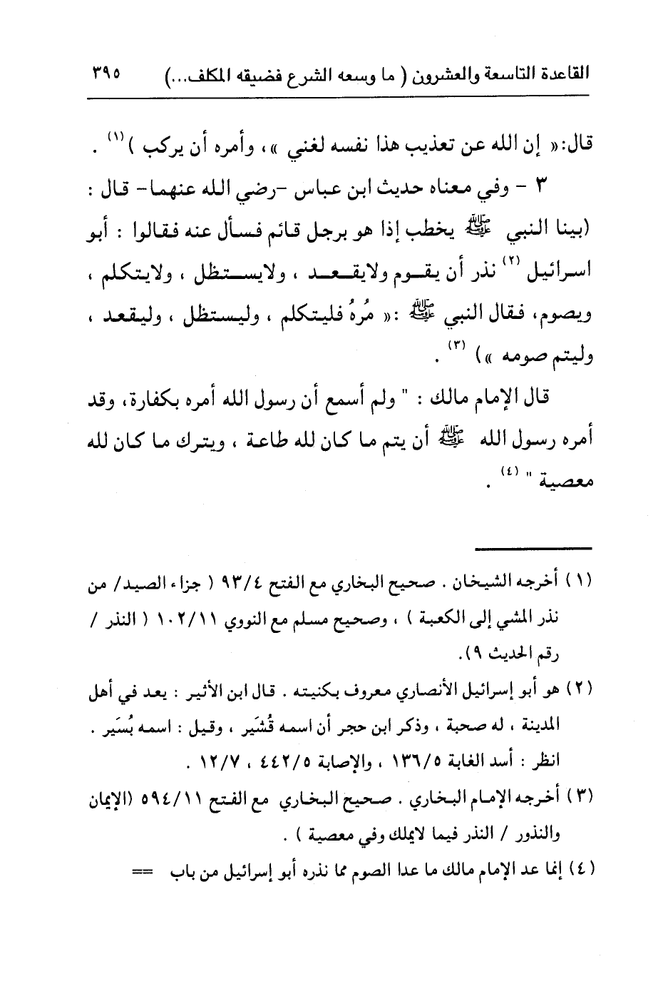 ٣- وفي معناه حديث ابن عباس رضي الله عنهما قال: "بينا النبي صلى الله عليه وسلم يخطب إذا هو برجل قائم فسأل عنه فقالوا: أبو إسرائيل٢ نذر أن يقوم ولا يقعد، ولا يستظل، ولا يتكلم، ويصوم، فقال النبي صلى الله عليه وسلم: "مُره فليتكلم، وليستظل، وليقعد، وليتم صومه" ٣.