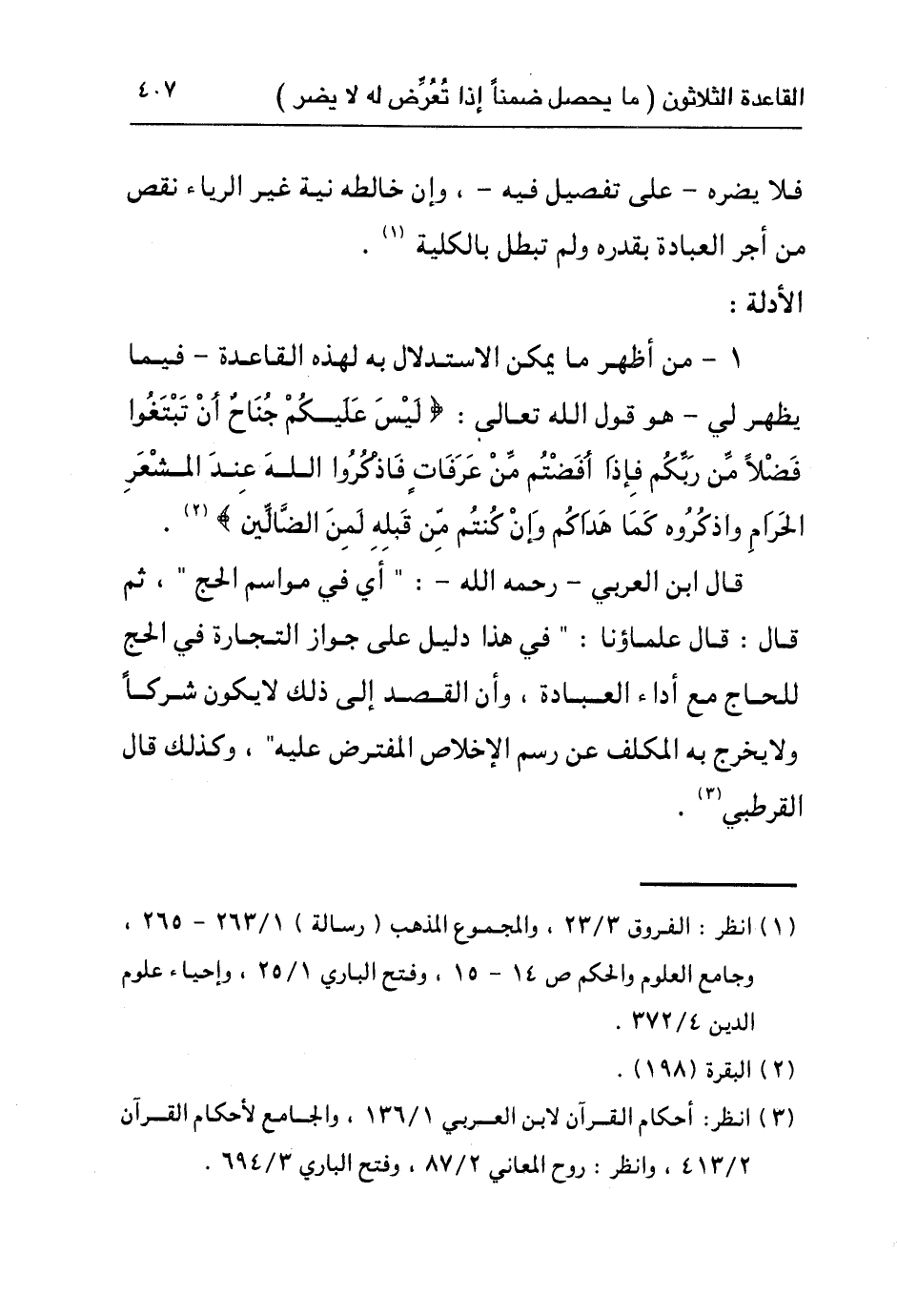 ١- من أظهر ما يمكن الاستدلال به لهذه القاعدة - فيما يظهر لي - هو قول الله تعالى: {لَيْسَ عَلَيْكُمْ جُنَاحٌ أَنْ تَبْتَغُوا فَضْلاً مِنْ رَبِّكُمْ فَإِذَا أَفَضْتُمْ مِنْ عَرَفَاتٍ فَاذْكُرُوا اللَّهَ عِنْدَ الْمَشْعَرِ الْحَرَامِ وَاذْكُرُوهُ كَمَا هَدَاكُمْ وَإِنْ كُنْتُمْ مِنْ قَبْلِهِ لَمِنَ الضَّالِّينَ} ٢.