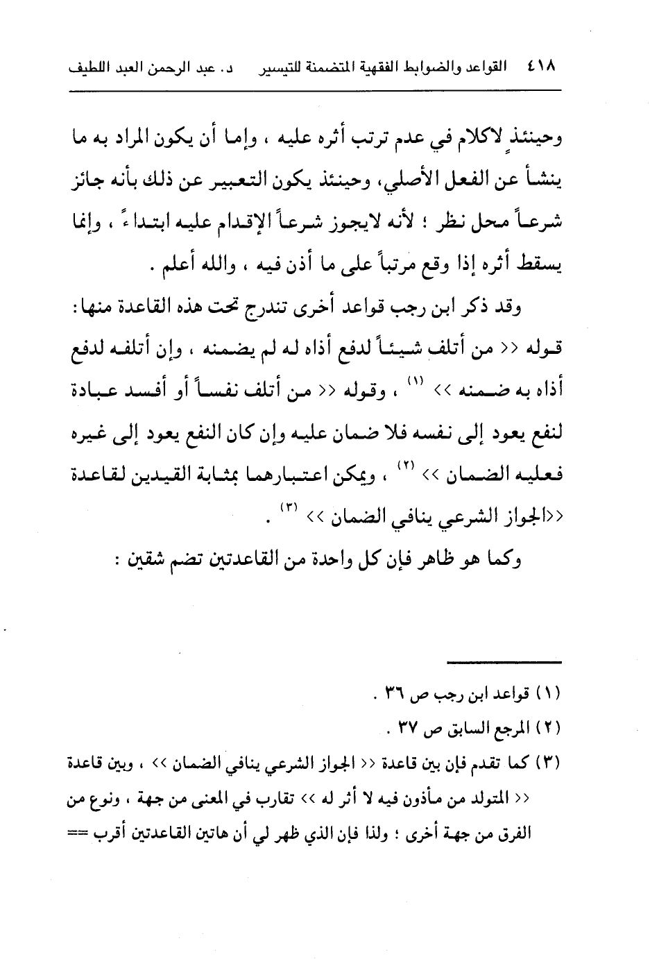 ٣ كما تقدم فإن بين قاعدة ((الجواز الشرعي ينافي الضمان)) ، وبين قاعدة ((المتولد من مأذون فيه لا أثر له)) تقراب في المعنى من جهة، ونوع من الفرق من جهة أخرى؛ ولذا فإن الذي ظهر لي أن هاتين القاعدتين أقرب إلى كونهما مقيدتين لقاعدة ((الجواز الشرعي ... )) من كونهما مقيدتين لقاعدة ((المتولد ... )) ؛ لأن ما ذكر فيها من قبيل ما يجوز شرعا لا من قبيل ما يتولد عن مأذون فيه أو جائز شرعا. والله أعلم.