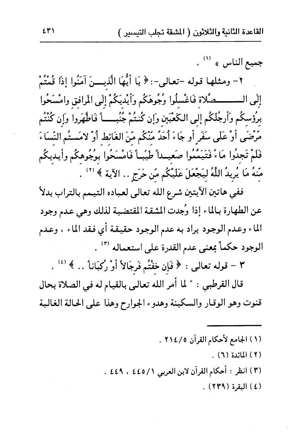 ٢- ومثلها قوله تعالى: {يَا أَيُّهَا الَّذِينَ آمَنُوا إِذَا قُمْتُمْ إِلَى الصَّلاةِ فَاغْسِلُوا وُجُوهَكُمْ وَأَيْدِيَكُمْ إِلَى الْمَرَافِقِ وَامْسَحُوا بِرُؤُوسِكُمْ وَأَرْجُلَكُمْ إِلَى الْكَعْبَيْنِ وَإِنْ كُنْتُمْ جُنُباً فَاطَّهَّرُوا وَإِنْ كُنْتُمْ مَرْضَى أَوْ عَلَى سَفَرٍ أَوْ جَاءَ أَحَدٌ مِنْكُمْ مِنَ الْغَائِطِ أَوْ لامَسْتُمُ النِّسَاءَ فَلَمْ تَجِدُوا مَاءً فَتَيَمَّمُوا صَعِيداً طَيِّباً فَامْسَحُوا بِوُجُوهِكُمْ وَأَيْدِيكُمْ مِنْهُ مَا يُرِيدُ اللَّهُ لِيَجْعَلَ عَلَيْكُمْ مِنْ حَرَجٍ} ٢.