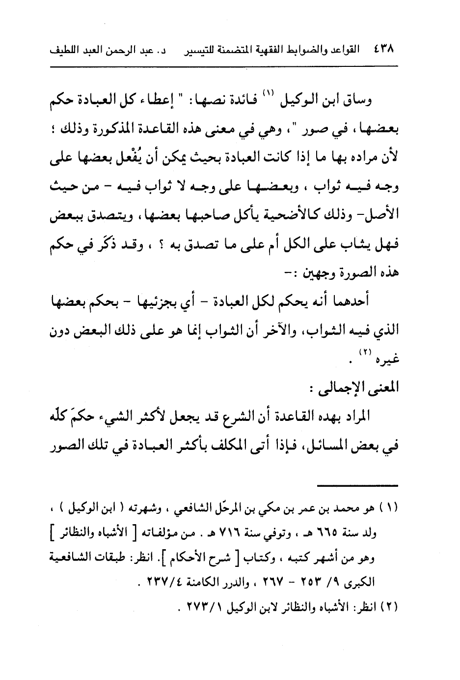 ١ هو: محمد بن عمر بن مكي بن المرحّل الشافعي، وشهرته (ابن الوكيل) ، ولد سنة ٦٦٥هـ، وتوفي سنة ٧١٦هـ. من مؤلفاته [الأشباه والنظائر] وهو من أشهر كتبه، وكتاب [شرح الأحكام] . انظر: طبقات الشافعية الكبرى ٩/٢٥٣-٢٦٧، والدرر الكامنة ٤/٢٣٧.