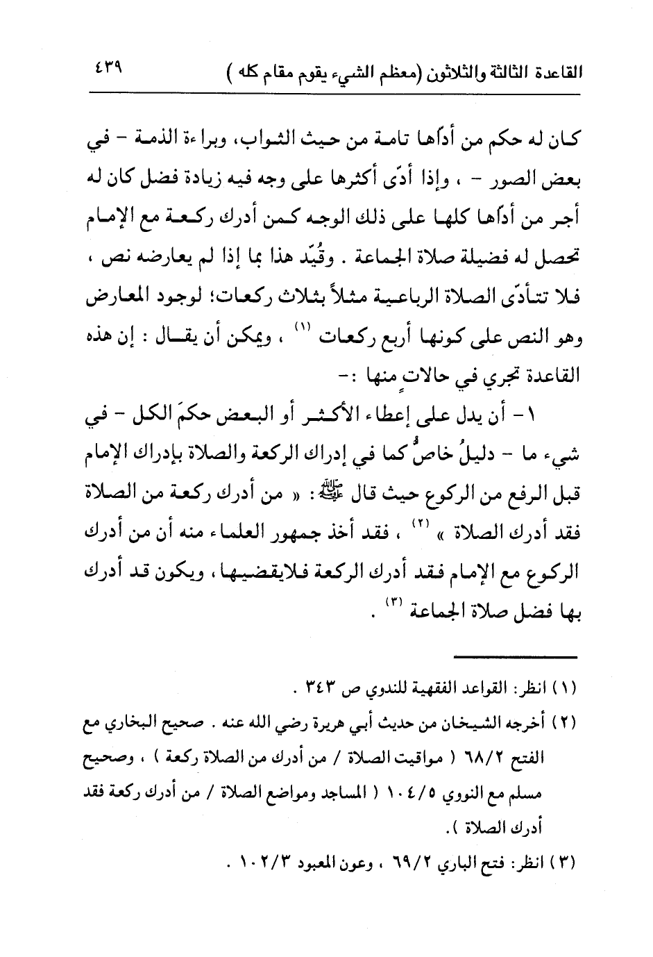 كان له حكم من أداها تامة من حيث الثواب، وبراءة الذمة – في بعض الصور -، وإذا أدى أكثرها على وجه فيه زيادة فضل كان له أجر من أدّاها كلها على ذلك الوجه كمن أدرك ركعة مع الإمام تحصل له فضيلة صلاة الجماعة. وقُيّد هذا بما إذا لم يعارضه نص، فلا تتأدى الصلاة الرباعية مثلا بثلاث ركعات؛ لوجود المعارض وهو النص على كونها أربع ركعات١، ويمكن أن يقال: إن هذه القاعدة تجري في حالات منها: