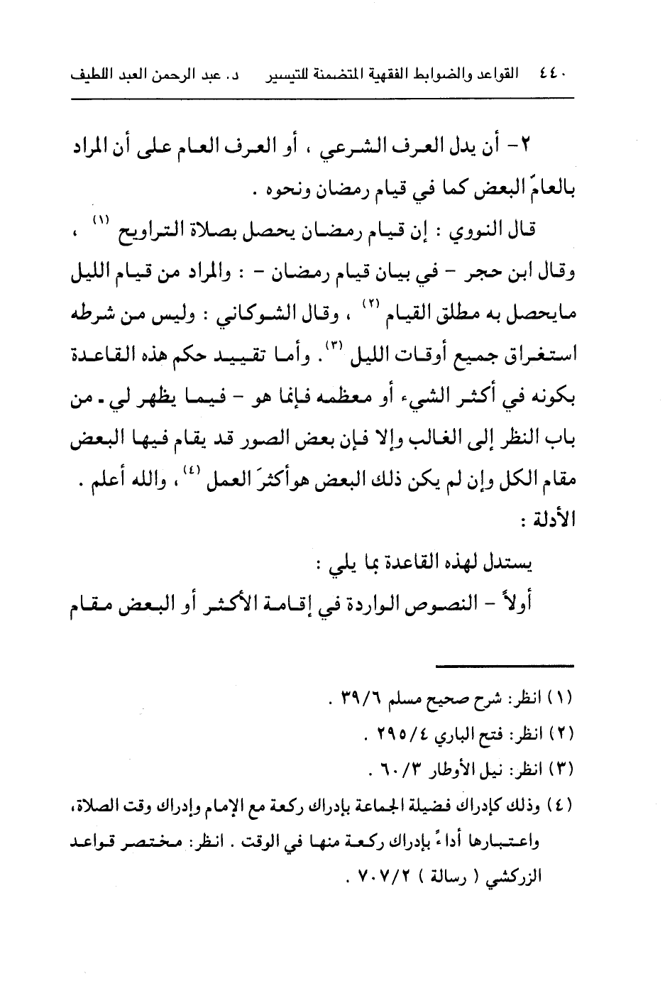 قال النووي: "إن قيام رمضان يحصل بصلاة التراويح"١، وقال ابن حجر – في بيان قيام رمضان -: "والمراد من قيام الليل ما يحصل به مطلق القيام"٢، وقال الشوكاني: "وليس من شرطه استغراق جميع أوقات الليل"٣. وأما تقييد حكم هذه القاعدة بكونه في أكثر الشيء أو معضمه فإنما هو – فيما يظهر لي – من باب النظر إلى الغالب وإلا فإن بعض الصور قد يقام فيها البعض مقام الكل وإن لم يكن ذلك البعض هو أكثر العمل٤، والله أعلم.