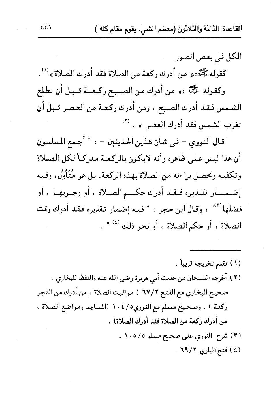 ٢ أخرجه الشيخان من حديث أبي هريرة رضي الله عنه واللفظ للبخاري. صحيح البخاري مع الفتح ٢/٦٧ (مواقيت الصلاة / من أدرك من الفجر ركعة) ، وصحيح مسلم مع النووي ٥/١٠٤ (المساجد ومواضع الصلاة / من أدرك ركعة من الصلاة فقد أدرك الصلاة) .