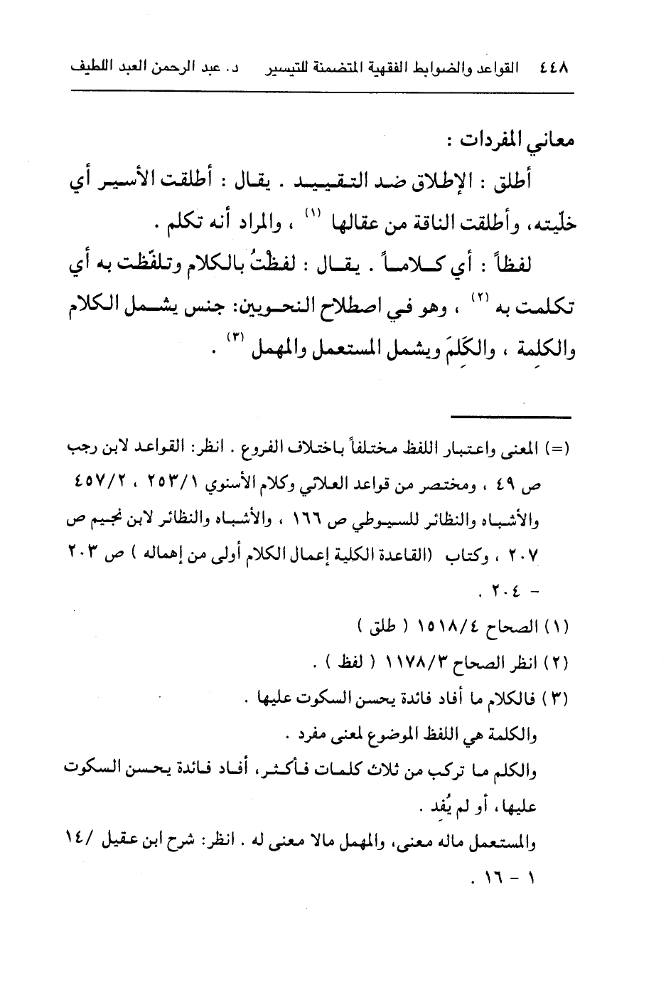 ٣ فالكلام ما أفاد فائدة يحسن السكوت عليها. والكلمة هي اللفظ الموضوع لمعنى مفرد. والكلم ما تركب من ثلاث كلمات فأكثر، أفاد فائدة يحسن السكوت عليها، أو لم يفد. والمستعمل ماله معنى، والمهمل ما لا معنى له. انظر: شرح ابن عقيل ١/١٤-١٦.: