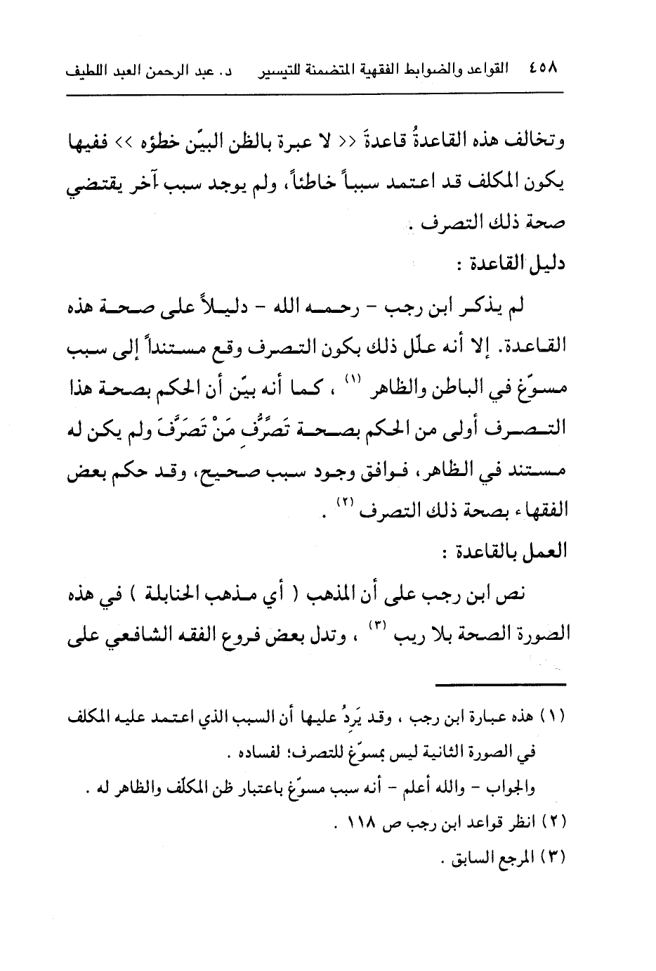 ١ هذه عبارة ابن رجب، وقد يرد عليها أن السبب الذي اعتمد عليه المكلف في الصورة الثانية ليس بمسوغ للتصرف؛ لفساده. والجواب والله أعلم أنه سبب مسوغ باعتبار ظن المكلف والظاهر له.