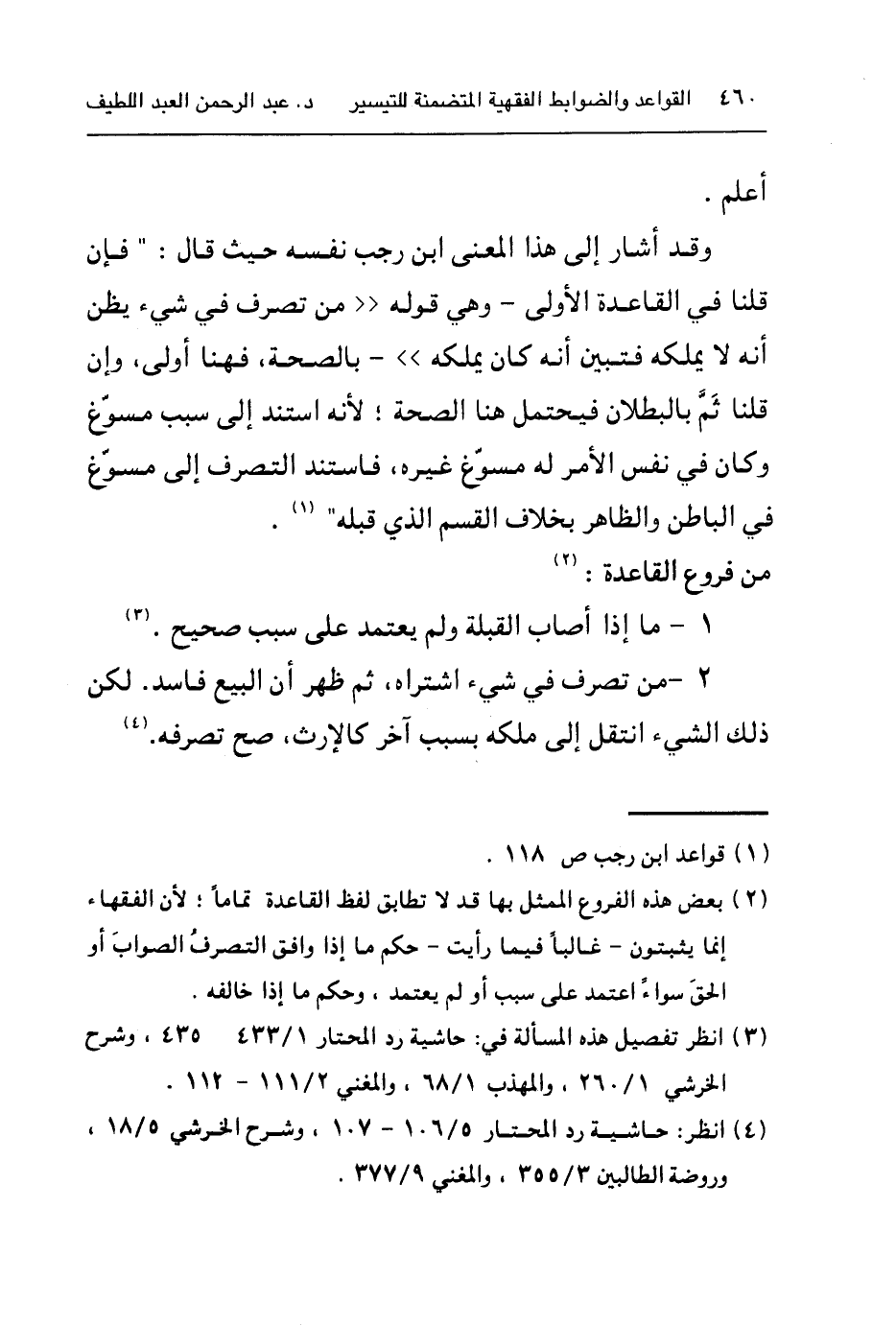 ٢ بعض هذه الفروع الممثل بها قد لا تطابق لفظ القاعدة تماما؛ لأن الفقهاء إنما يثبتون – غالبا فيما رأيت – حكم ما إذا وافق التصرف الصواب أو الحق سواء اعتمد على سبب أو لم يعتمد، وحكم ما إذا خالفه.