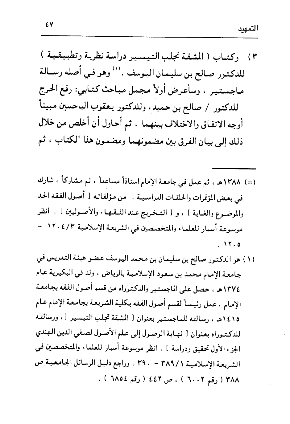 ١ هو الدكتور صالح بن سليمان بن محمد اليوسف عضو هيئة التدريس في جامعة الإمام محمد بن سعود الإسلامية بالرياض، ولد في البكيرية عام ١٣٧٤هـ، حصل على الماجستير والدكتوراه من قسم أصول الفقه بجامعة الإمام، عمل رئيسا لقسم أصول الفقه بكلية الشريعة بجامعة الإمام عام ١٤١٥هـ، رسالته للماجستير بعنوان: [المشقة تجلب التيسير] ، ورسالته للدكتوراه بعنوان [نهاية الوصول إلى علم الأصول لصفي الدين الهندي الجزء الأول تحقيق ودراسة] ، انظر: موسوعة أسبار للعلماء والمتخصصين في الشريعة الإسلامية ص٣٨٨ (رقم ٦٠٠٢) ، ص٤٤٢ (رقم ٦٨٥٤) .