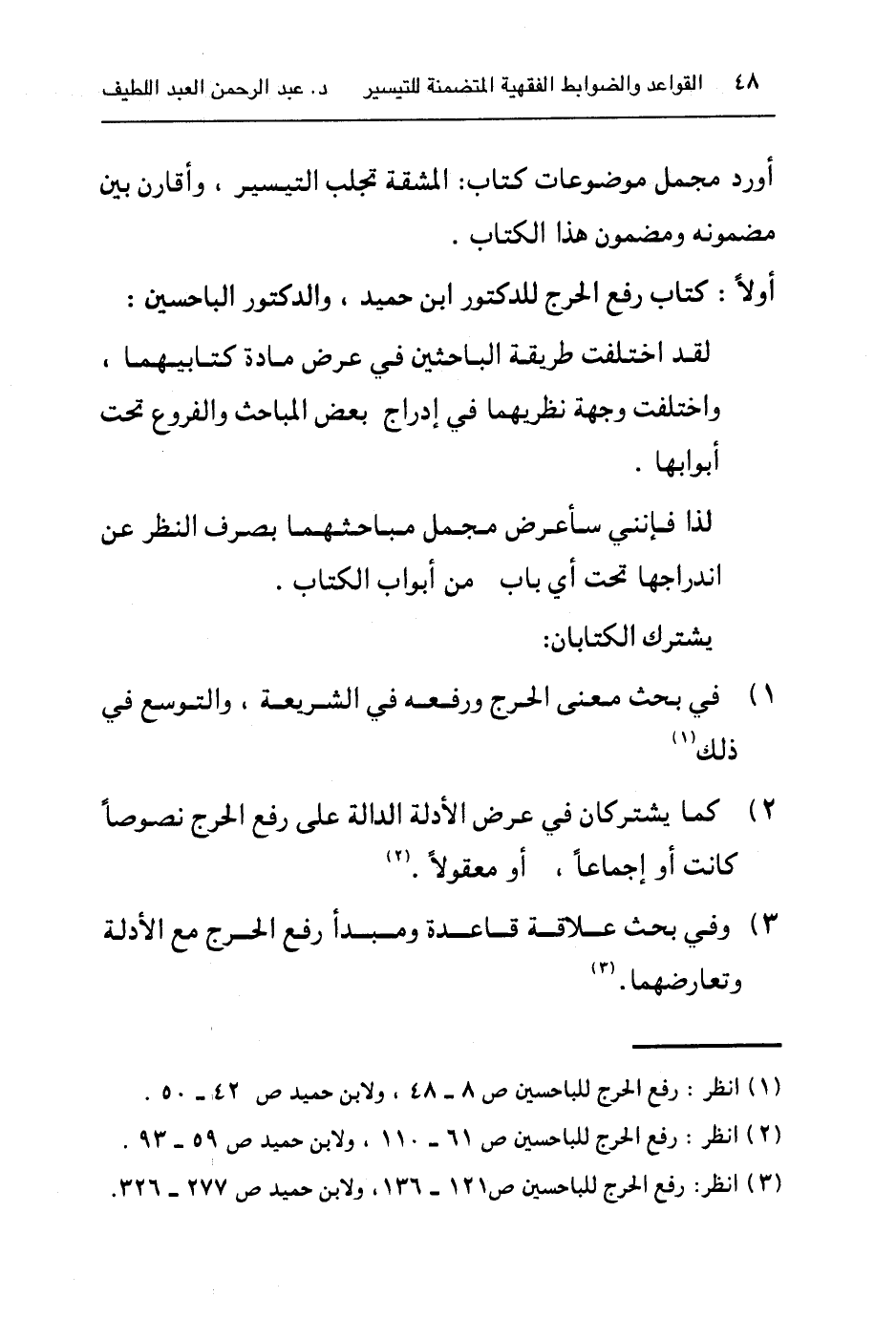 أولا: كتاب رفع الحرج للدكتور ابن حميد، والدكتور الباحسين: لقد اختلفت طريقة الباحثين في عرض مادة كتابيهما، واختلفت وجهة نظريهما في إدراج بعض المباحث والفروع تحت أبوابها.